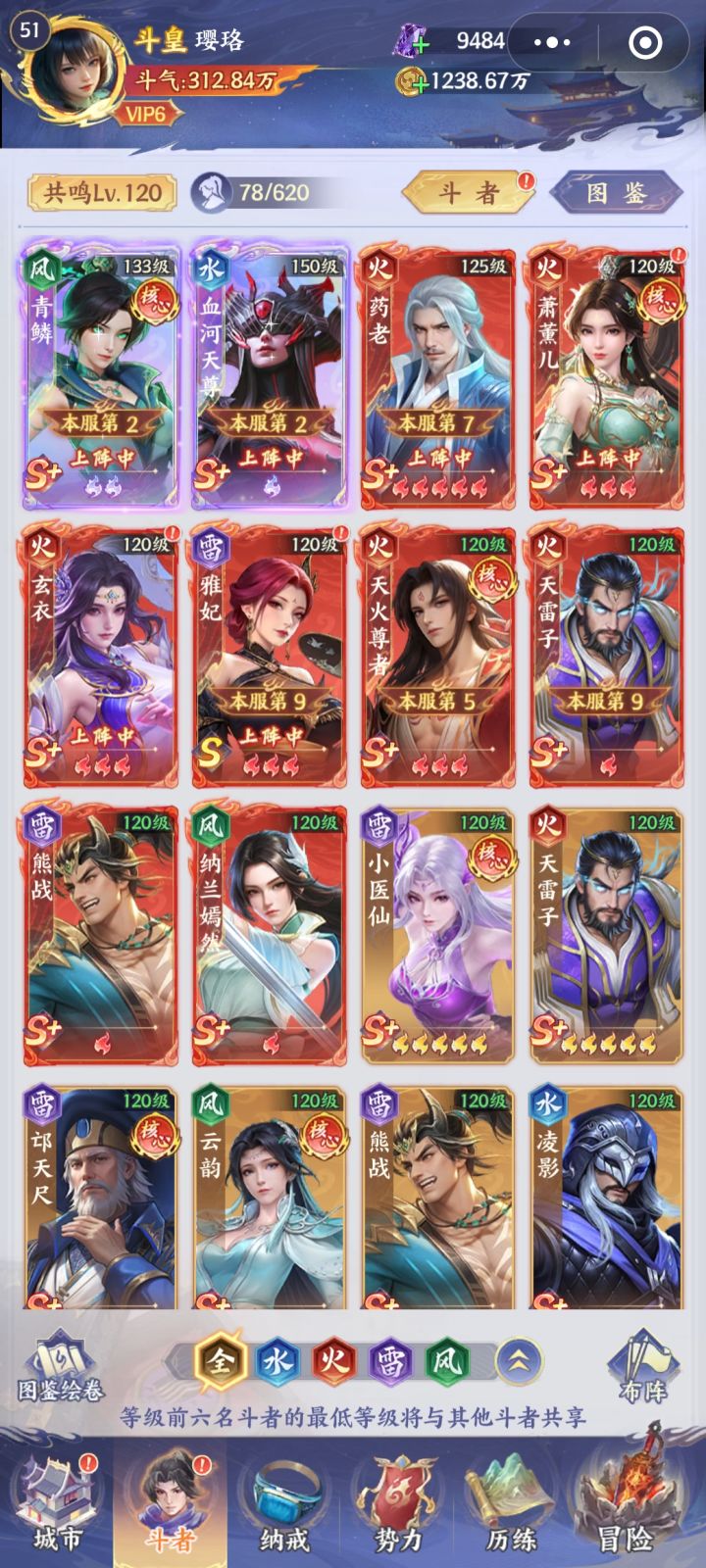 萧炎第四天就可以帝境了,之所以没升是考虑收益最大化,彩5可以吃到炎帝活动满奖励.升帝境的本体可以后边慢慢等抽到白嫖.其余4个小娘们全彩1是为了解锁天赋,目前萧炎站在5号位=======第一回合轮到他出手时可达16怒气.========至于这个熊战纯冲人数的,钻3正好后边给萧炎当狗粮升帝境.爬塔轻松越战接近一倍战力,毋庸置疑的简单粗暴目前PVP一拳超人,任何队伍即使同战力也是全屏秒杀,火
