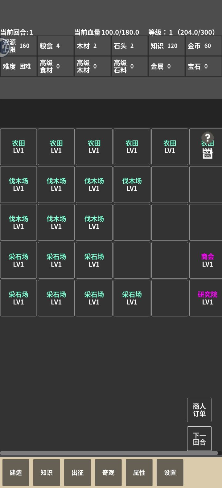 前期先压榨剩余资源全部投入到建伐木厂采石场农田,简单以上第一次的订单不用管(订单七回合刷新)(最低难度不管订单,因为没商会,金币只有开地块一个作用而且只够开第一档(150),打怪爆的钱袋就够用了)压资源,10回合开始出怪弄个三级训练场糊弄一下到了28回合左右开始搞美食街,木石加工厂稍微慢一点点,因为7级军营只要320高级木+高级石。