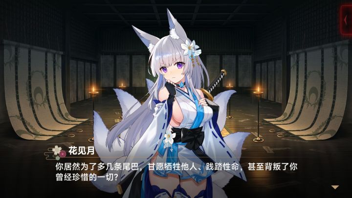 首先就是日系的角色设计和充满和风风格的场景画面,几个女角色都有着不同妖怪的外形形象,2D的画作和动态的cg质量也是相当的精致,这些以妖怪为主题的美少女们,其实还是通过这些角色头上不同的耳朵形象进行区分,不过这些角色都很可爱。除此之外,再就是这些角色的服饰设计,巫女啦、忍者啦这些服饰都会有所不同,细节也很多,而且每个角色都有独属于自己的主题色,这些通过整体服装颜色最多的部分可以区分出来。然后就是配音啦,日语的配音和二游真的很搭,就连生气不高兴的语调都感觉萌萌哒,还有就是bgm的使用,和背景氛围这些的搭配其实还可以,不过在悬疑的部分做的一般,有点强行的感觉。