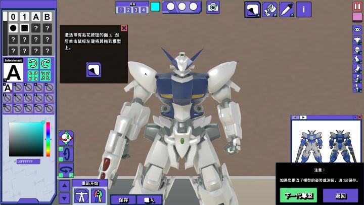 等拼装结束后,就会得到一款有着基本模样的原型了。这时候进入下一环节,右下角显示高达的各种配色,记住这里的颜色有多种方案,我们选择其中一种照着涂就好。涂色工具和画图工具很像,有吸管,有喷漆,还有颜色丰富的上色板,可以加高光,加贴纸,武器也可以自由装备。还有四种模型风格,哑光、阴影、高光都有,感兴趣的话可以自由调试,这个东西也没有打分标准,答案也不会只有一种,完全是看个人发挥。上完色后可以调节各个关节的角度,摆出帅气的姿势,这里面的调节方式是每个大型部件都有,比如头、手、足之类的地方,调节角度是三个方向360度调节,摆出各种姿势都很正常。不过这个毕竟不是现实拼装,不用担心部件损坏的问题。