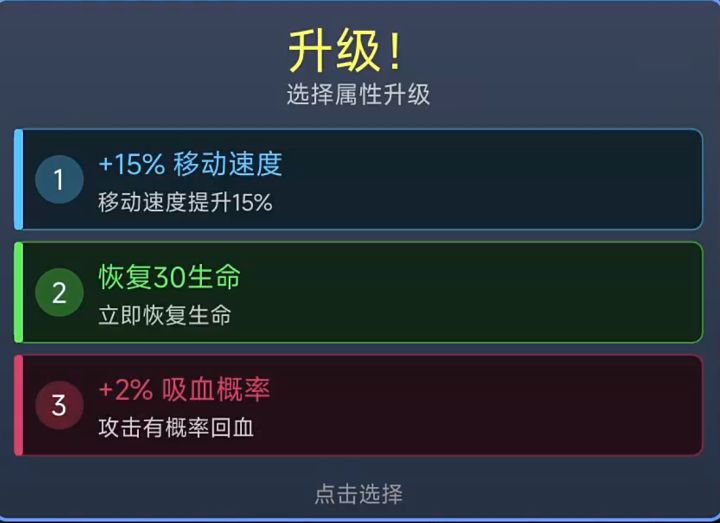 但玩着玩着,槽点也真的跟着一个一个冒出来了,首先就是武器平衡也太离谱了吧,激光的统治力强得没边,打伤害基本全靠它,我试了好几轮,都没太搞懂武士刀到底有啥大用,真的有点鸡肋。还有属性选择这块,选个加血加吸血的,基本就死不掉了,数值这块真的得好好调调。