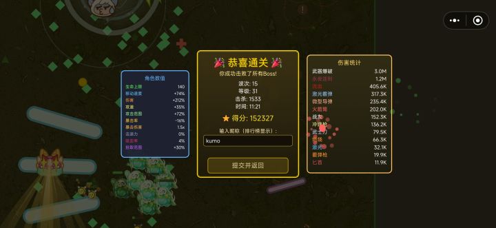 玩到一半才反应过来,游戏角色原来是派对之星😂第二把打到了十二波,狂战士+吸血鬼buff,回旋镖+激光合成的棱镜光束也挺给力。