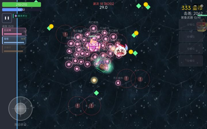 全程就是跑,加点血量上限,加点杀怪回血,加点移动速度,有个老怪有减速的阵法,碰到老怪就是死,离它远远的。一共12关,瞅准了,最后一关之前一定要买一次性的帮手,越多越好,我买了三个,没买的时候转圈圈磨了半天,买了以后还是转圈圈,因为老怪远程攻击盯着你打,但是伤害就交给帮手打,随随便便老怪就被打死了。只有一个地图,没有持续可玩性。左手操作也不舒服,不能更换右手操作。