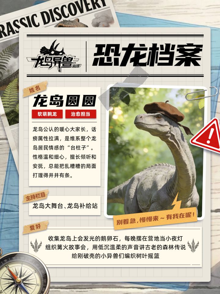各位探险家们!紧急集合⚠️ 重大爆料!龙岛探秘第一篇,直接放大招! 我已偷偷窃取到一份超稀有「龙岛核心搭子机密档案」,全程无废话、全是猛料🤣 谁懂啊!原来神秘龙岛不止有远古异兽,还有三位隐藏的核心向导,它们掌管着龙岛的大半“内幕”,想混熟龙岛、拿捏异兽小秘密,全靠这三位搭子带路!来一起扒一扒这三位龙岛显眼包的真实面目✨ 🌿 龙岛 · 圆圆 📄软萌腕龙|治愈担当 🔐 小道消息:#龙岛异兽