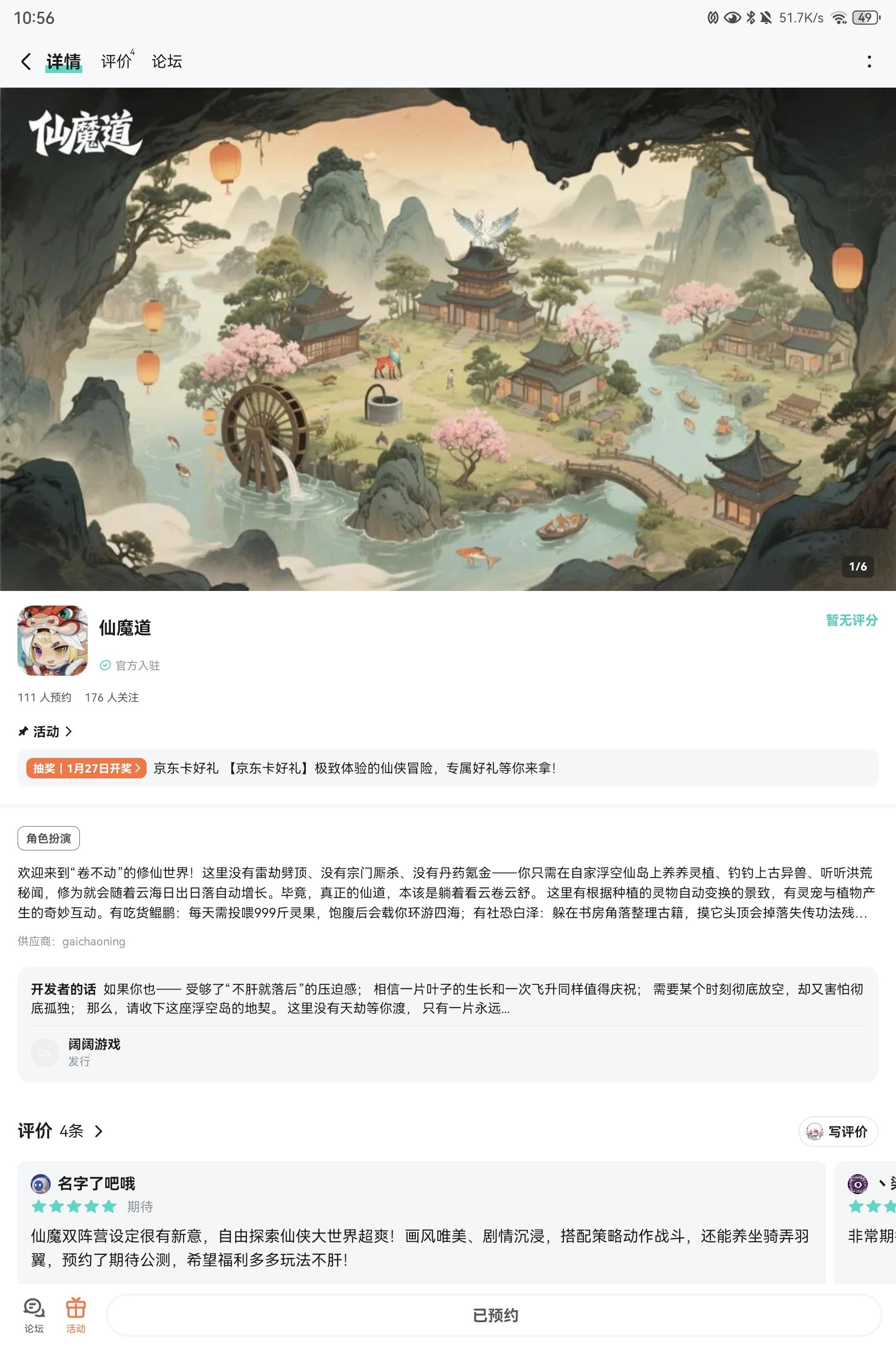 专属福利:【京东卡抽奖活动】▶ 参与方式1.点击关注发帖账号并关注《魔道仙》2.在本帖下方评论区分享发帖链接即可【奖品发放】到达开奖时间后,由taptap系统随机抽取符合要求的幸运玩家,自动发放兑换码(对于同一账号大量故意发布评论刷楼层导致其他玩家中奖概率降低的行为的用户,将会可能被取消参与资格!)▶ 活动奖励活动结束后将抽取位1幸运儿获得1张10元京东卡解锁更多机缘:📢 第一时