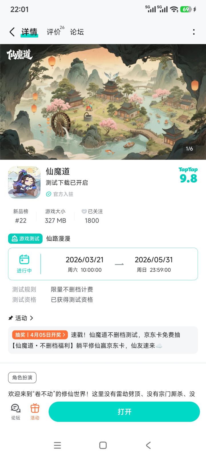 各位卷不动的仙友们好~欢迎来到《仙魔道》的佛系修仙世界,这里无雷劫、无厮杀、无氪金,养灵植、撸灵宠、看云海,修为随日出日落自动增长,主打一个精神归隐!恰逢游戏不删档测试开启,小仙为大家准备了专属福利抽奖,京东卡免费送,快来躺赢福利啦~📝 参与方式1.点击关注本发帖账号,并预约 / 关注《仙魔道》游戏主页2.在游戏《仙魔道》论坛发布一个新帖子(内容不限~)3.回到本帖评论区,附上你的发帖