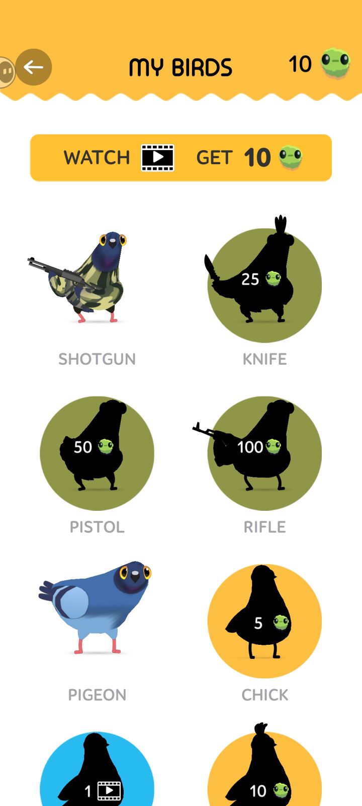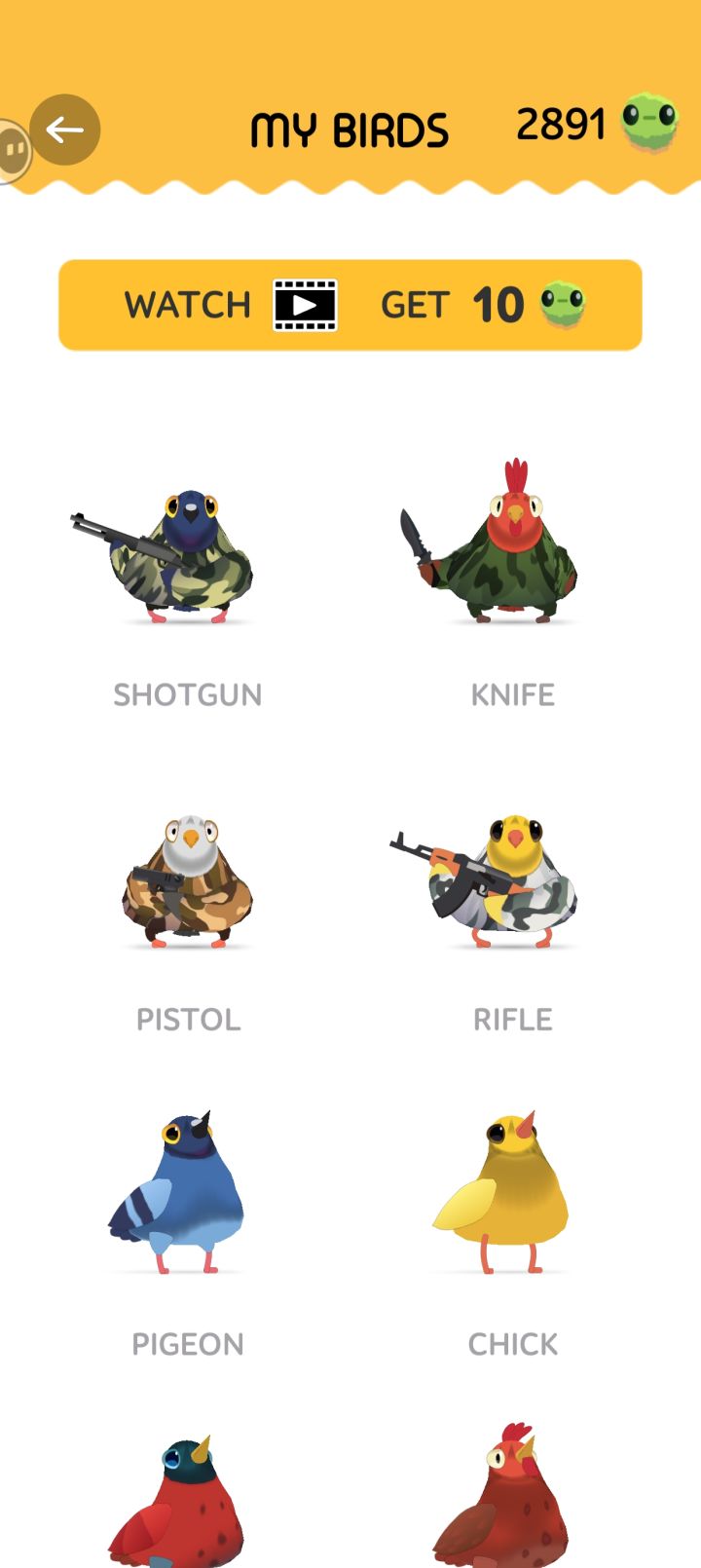 你可能会对游戏中这只不断活蹦乱跳的鸽子感兴趣,但实际上,游戏里并非仅仅只有这只鸽子,点击主页面右下角里,玩家可以通过看广告、或者使用虫子,来兑换其他的鸟类角色再进行游玩。