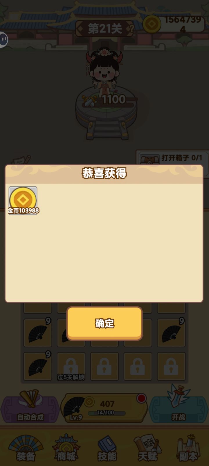 开个箱子9级扇子才409金币,这个9级的,给他分解了,能得10万+金币,无限刷金币啊!