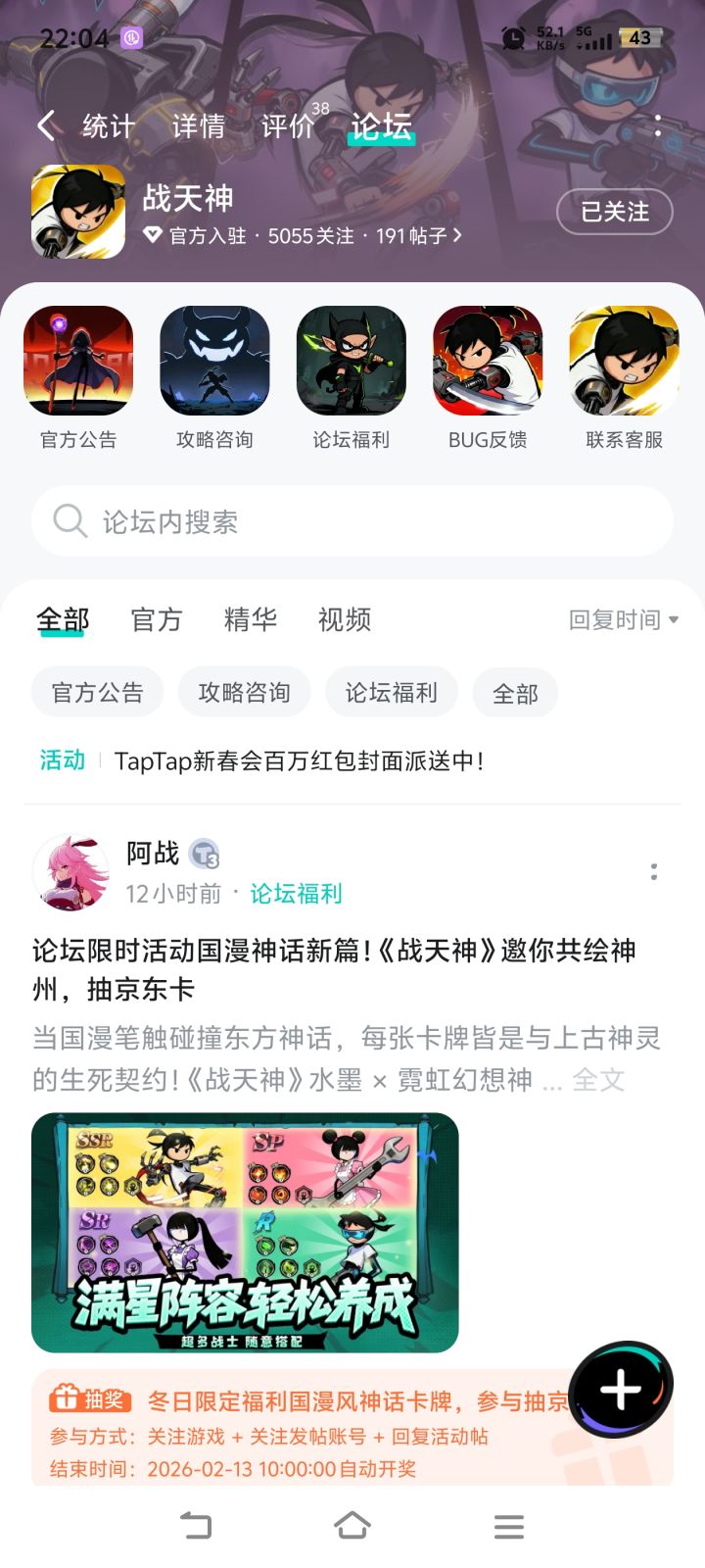 当国漫笔触碰撞东方神话,每张卡牌皆是与上古神灵的生死契约!《战天神》水墨 × 霓虹幻想神州来袭,多格漫画式战斗、全屏动态分镜、数百匠心国风神魔卡牌,深度羁绊 + 多线剧情,探索山海经、天庭、赛博龙宫,指尖谱写你的神话传奇!🎁 活动奖励抽取1 位幸运玩家,赠送京东卡1 张!📝参与条件1.点击预约《战天神》并发新帖晒截图2.在本帖下方评论区分享发帖链接即可⏰奖品发放到达开奖时间后,由ta