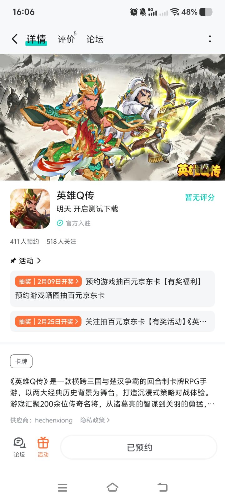 论坛专属活动已启,速来参与赢福利!预约游戏发新帖晒截图,赢百元京东卡!【参与方式】1.点击关注预约游戏并发新帖晒截图2.在本帖下方评论区分享发帖链接即可【活动时间】即日起至2月5日【活动奖励】随机抽取1名符合参与条件的玩家获得:100元京东卡一张【活动规则】1.内容禁止涉及暴力、色情、政治、恐怖内容,违者做删帖处理并取消活动资格;2.回复内容需与活动主题相关,若抽中楼层与主题