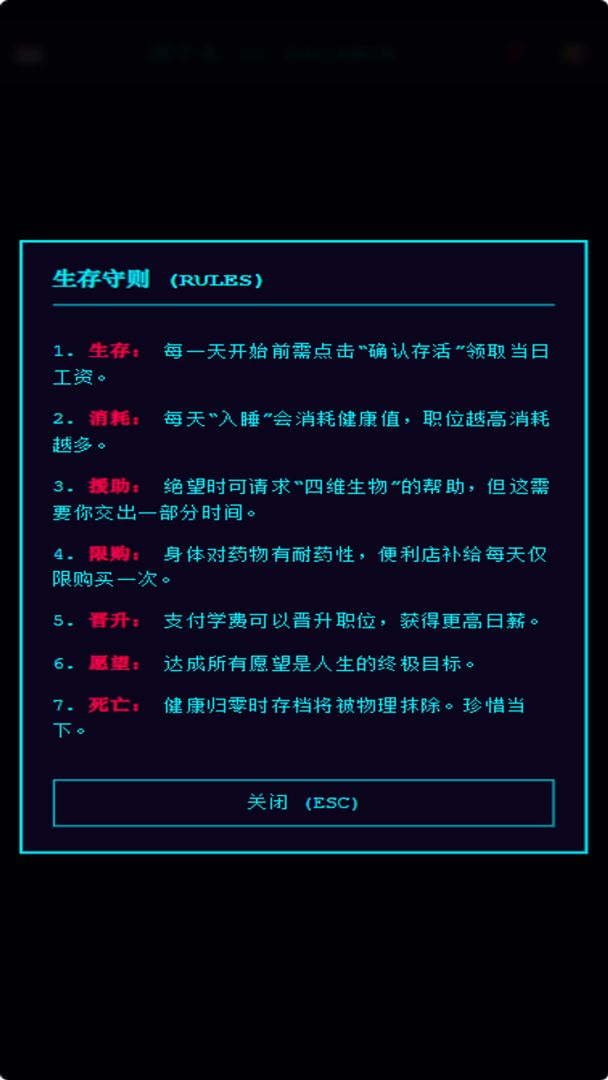 开发者的话当你按下第一个 [确认存活] 按钮时,你已经把自己交给了这套系统。 最初,我只想做一个简单的数值游戏。但后来我发现,我们每个人其实都在运行着这样一个 APP:每天醒来领取“点数”,然后将它分配给房东、外卖员、老板,最后剩下的那一点点,才是留给**“自己”**的。 在这个代码构建的小世界里,我刻意去掉了所有的圆角。因为现实是锋利的,系统是冷冰冰的。 我限制了你的补给次数,是为了让你感受到“身体不总是能被修好”的无奈。 我让职业越高消耗越快,是为了问你:那条不断攀升的日薪曲线,真的值得你用 ❤️ 健康去填平吗? 游戏里的结局只有一张**“电子销户单”**。 但我希望,当你真正放下手机,看向窗外的时候,你的那张“清单”上已经勾选了最重要的东西——不是存款,而是那个被你延误了很久的电话,或是那场期待已久的日出。 别在系统里活得太久,记得在现实里好好生活。