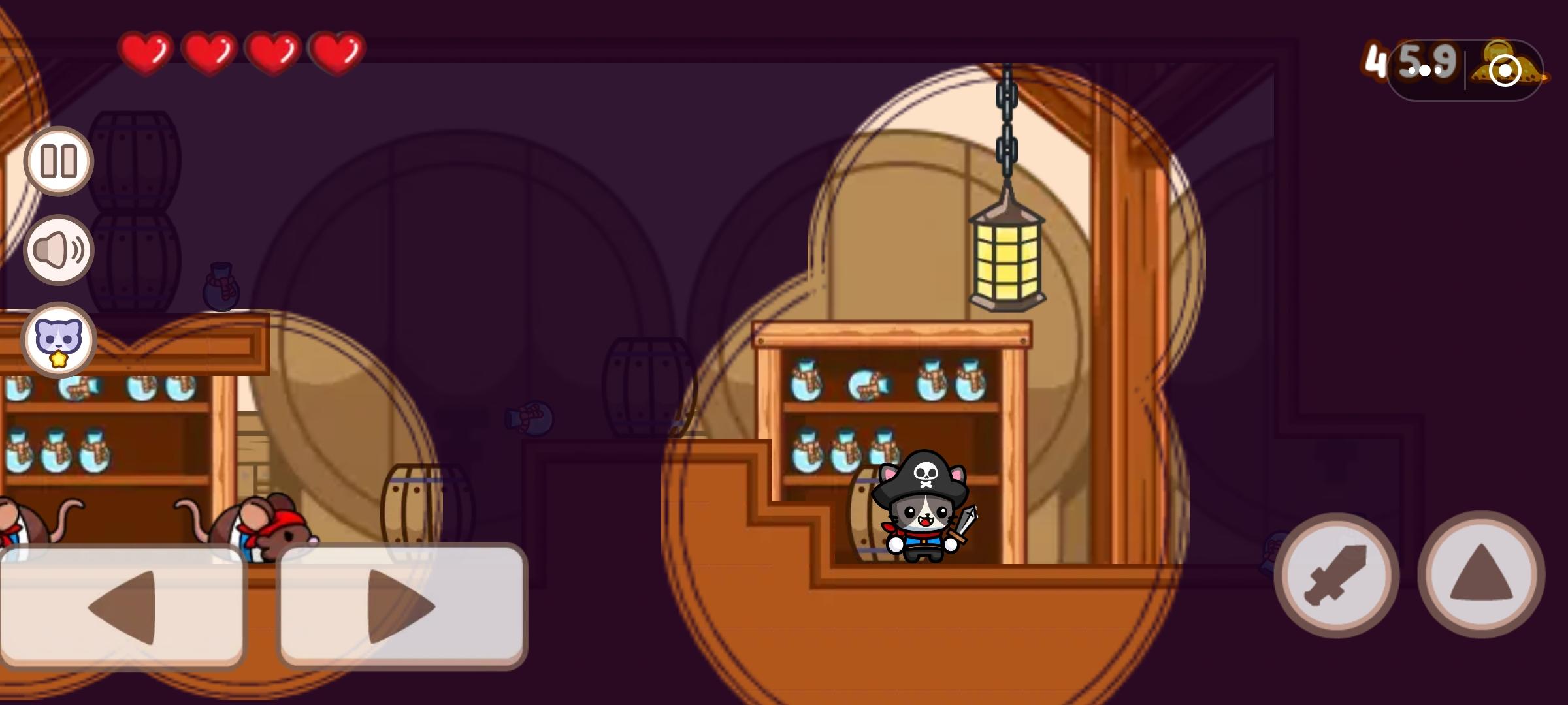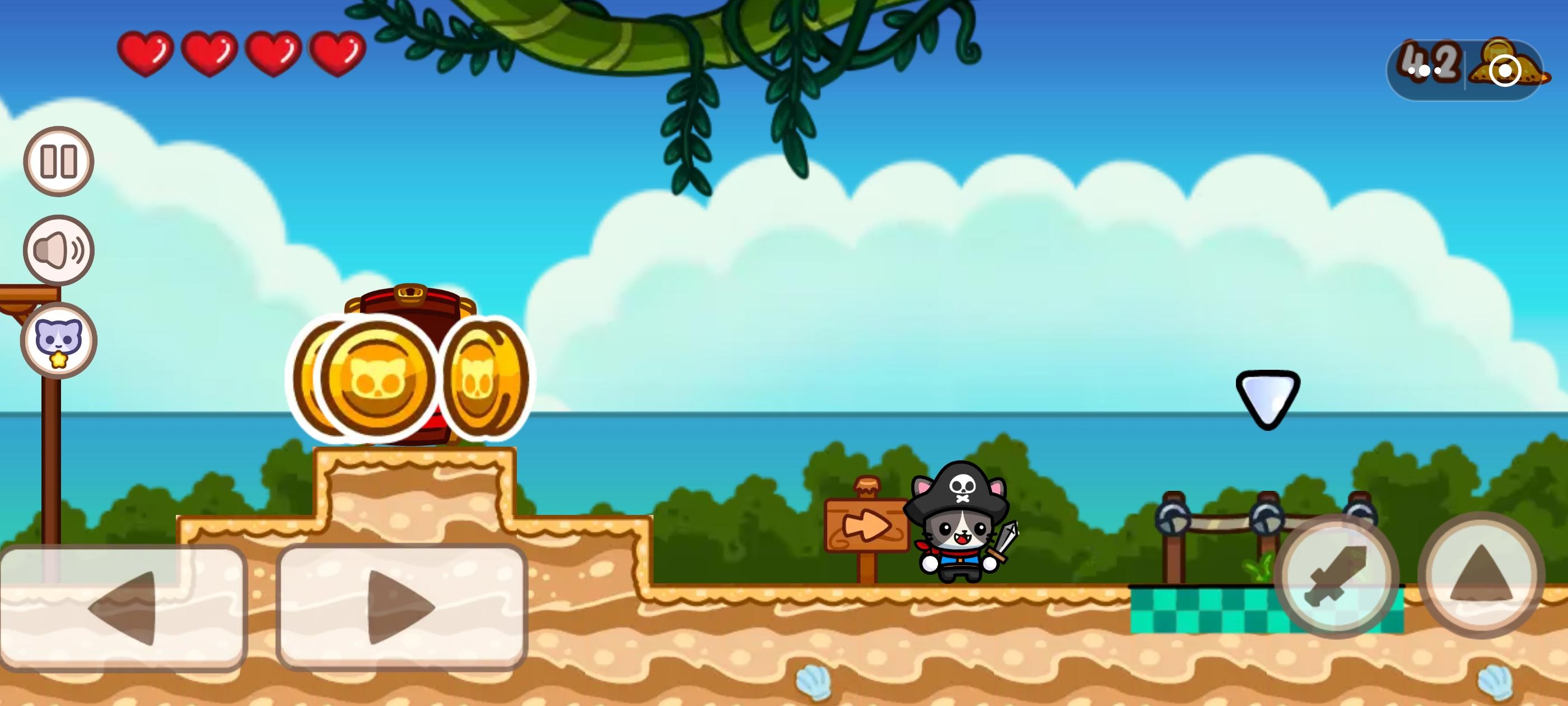 可玩性四星左右,因为平台跳跃的核心玩法有点烂大街,感觉非常的像换皮小游戏,跟这类游戏的鼻祖马里奥有点类似,通过踩踏敌人也可以对敌人造成攻击,但这种设计真的太熟悉了,此外就是需要控制小猫通过跳跃移动来跨越各种障碍,击败各种敌人到达终点,中途还需要收集金币和小鱼干,也会出现各种阻碍角色通关的陷阱和移动的平台,但都算不上特别新颖。