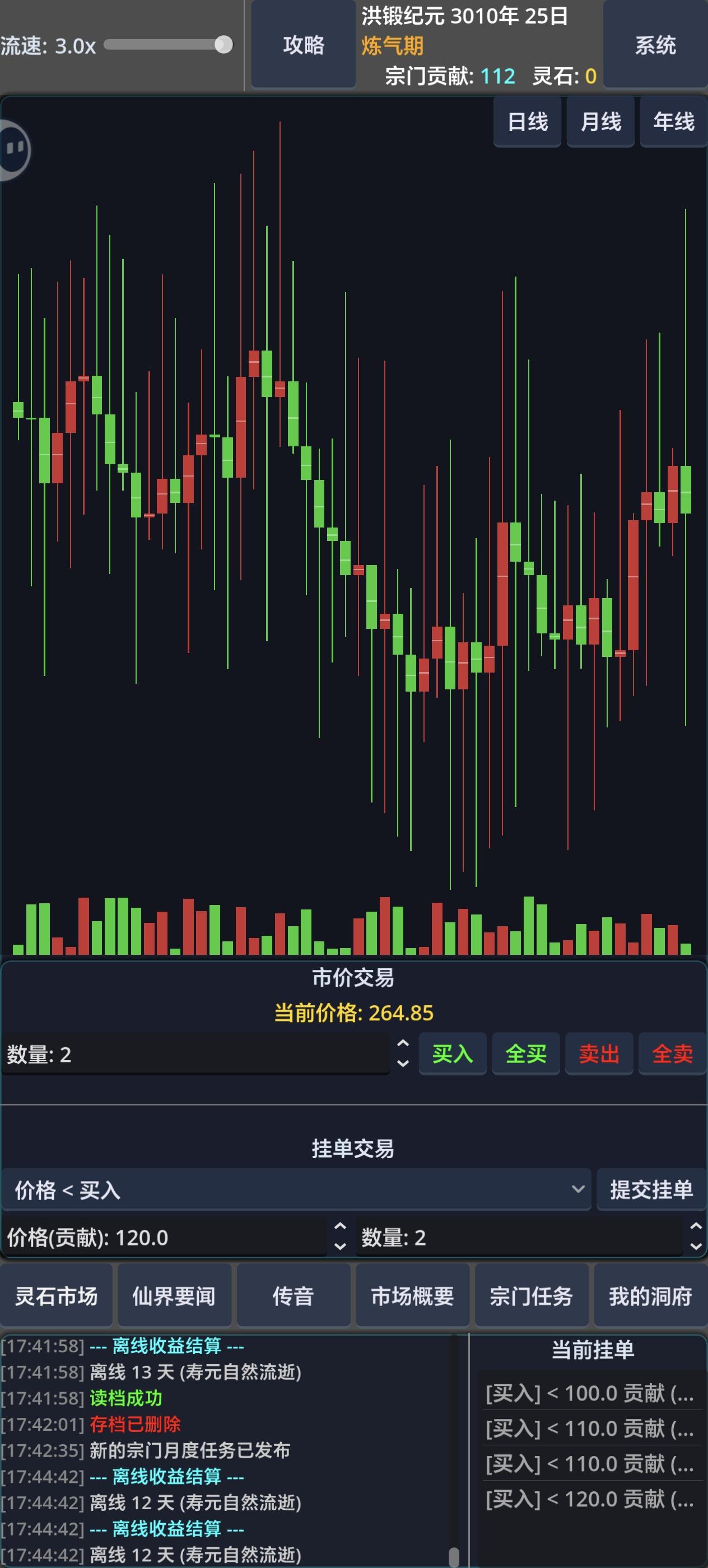 关键是不能重开,我贡献全挂低价买入去了,谁能想到灵石直接飙到三百贡献去了,又重开不了,只能等着时间自己过。之前不能重开但是作者看见之后直接改了