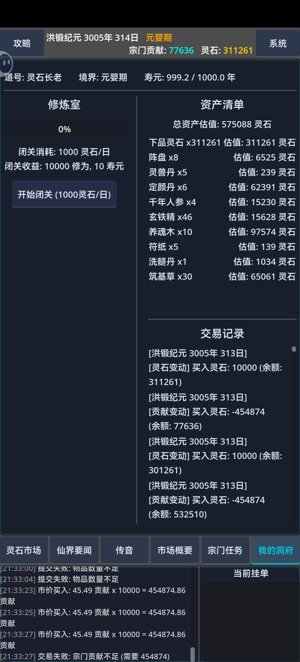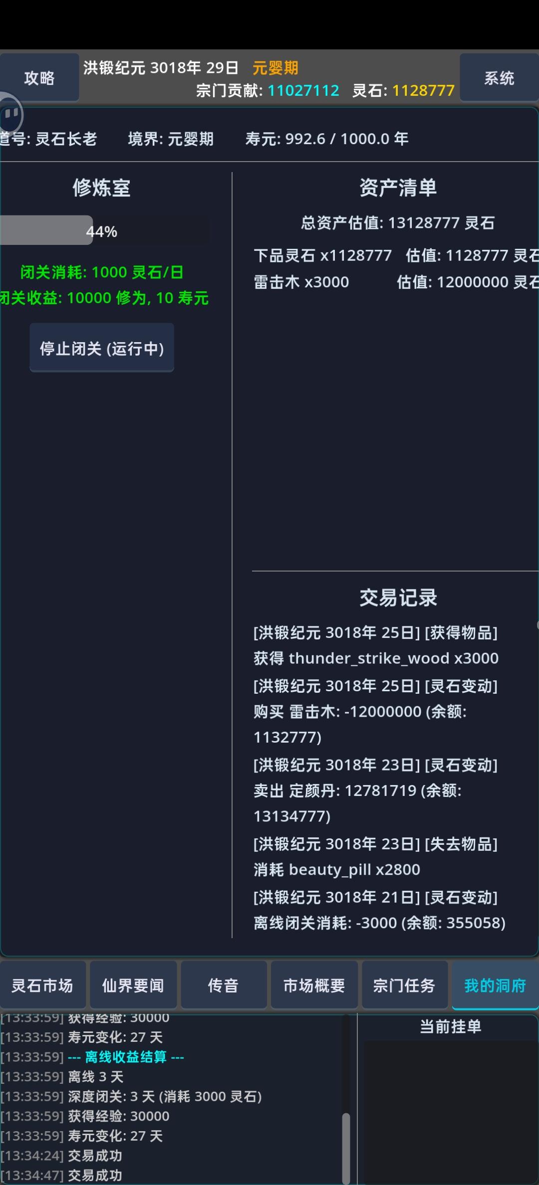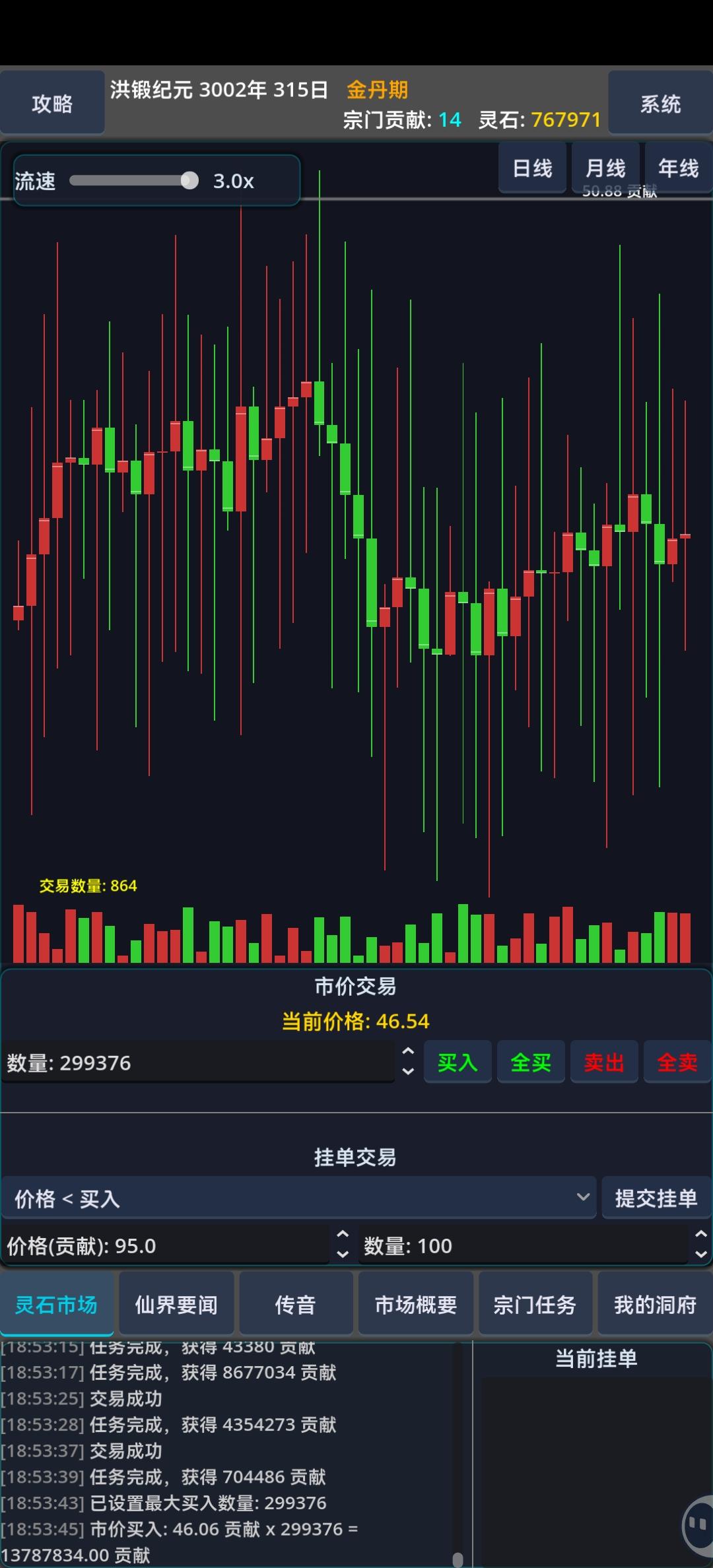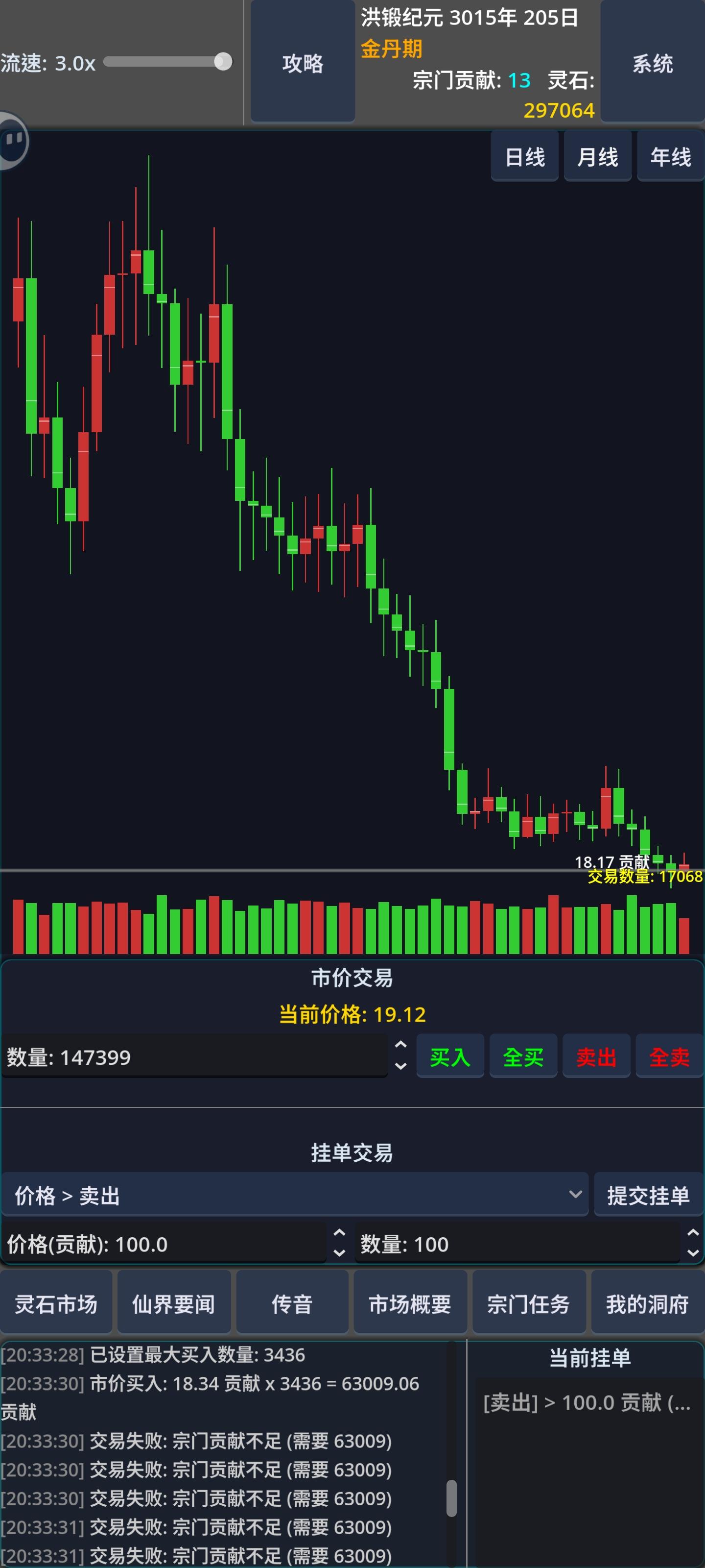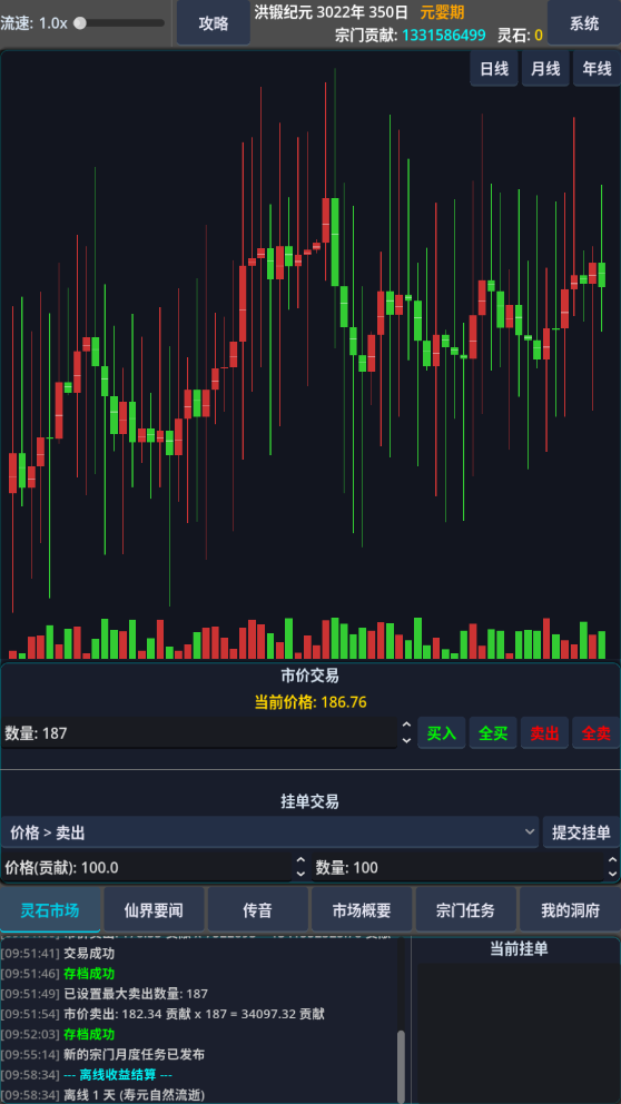 核心:做宗门任务逻辑:低买高卖,期货前期不断买符纸做任务,进行原始积累。中期低价购买零食,在论坛看了一下有提到打听消息的,这期间我没有去打听,就是无脑低价买零食,然后买更高级的物品完成宗门任务。后期零食和贡献几乎就没有意义了,所以后期突破要的贡献、材料费用、修为增加需要的零食也增加不少,不过已经很无聊了。tip:1、修为可要可不要,一百的年龄期限已经足够了,修为在这游戏意义不大。2、