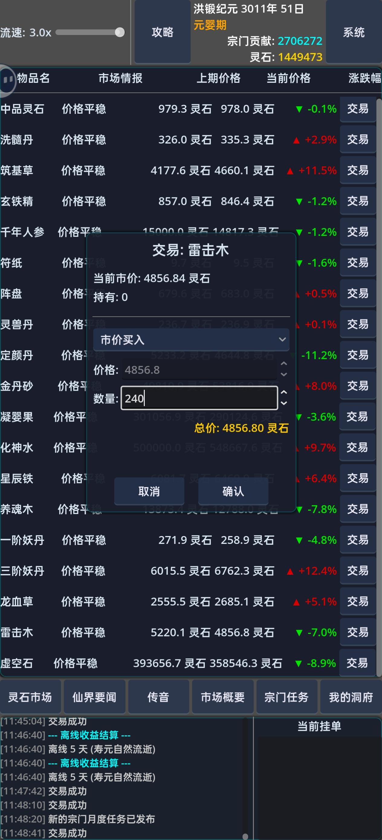 截止目前版本,定颜丹基准价4000,凝婴果25000,化神水500000,筑基草1000,以上几种波动大,价格随时大涨或大跌,只要在基准价附近,无脑买进,收益超过10%直接卖,无脑重复,玩一会就几千万了。这还是中途挂机了差不多10年,正常按照以上方法20年之内保底3000万灵石。