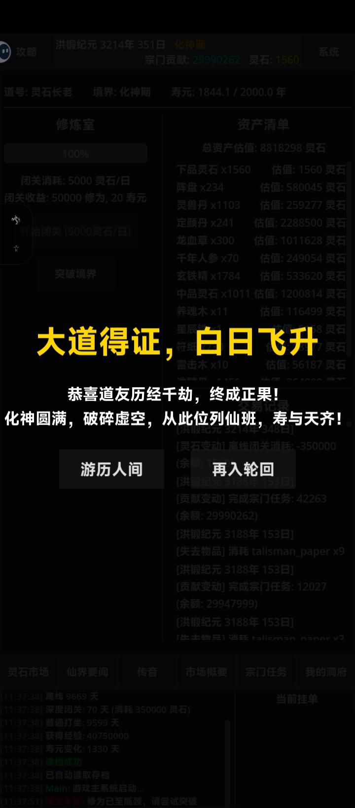 好像也不难,后期挺无聊的玩了两个半小时,元婴期,百万灵石了