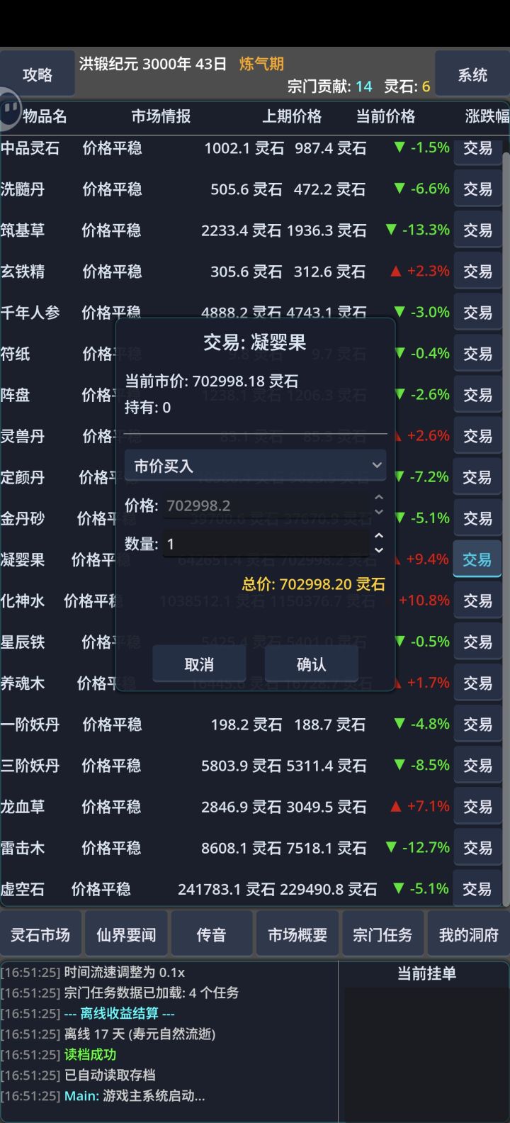 开始玩的时候,盯着灵石买卖。挂机看灵石涨涨跌跌感觉来钱很慢,不确定性也大,盯了很久,存了几千灵石。有点灵石后,发现市场好像更赚钱,开始考虑买卖货物,灵兽丹,筑基草,感觉能赚就梭哈。虽然一次性能赚得更多,但是等它涨价时间更漫长了,也想一次性赚更多。慢慢的,玩了几个小时赚到上千万灵石,境界也到了元婴期。到最后才发现一个bug如封面,在选中交易一种商品后,不要确认交易,在这个界面等着下一次价格