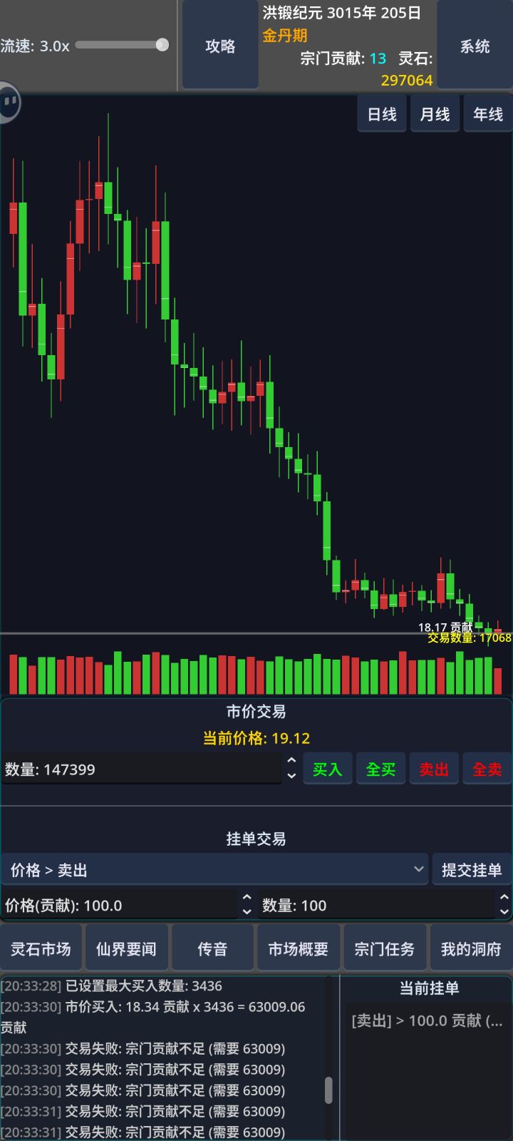 开始玩的时候,盯着灵石买卖。挂机看灵石涨涨跌跌感觉来钱很慢,不确定性也大,盯了很久,存了几千灵石。有点灵石后,发现市场好像更赚钱,开始考虑买卖货物,灵兽丹,筑基草,感觉能赚就梭哈。虽然一次性能赚得更多,但是等它涨价时间更漫长了,也想一次性赚更多。慢慢的,玩了几个小时赚到上千万灵石,境界也到了元婴期。到最后才发现一个bug如封面,在选中交易一种商品后,不要确认交易,在这个界面等着下一次价格