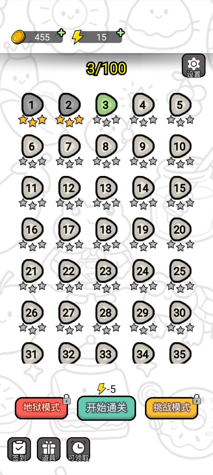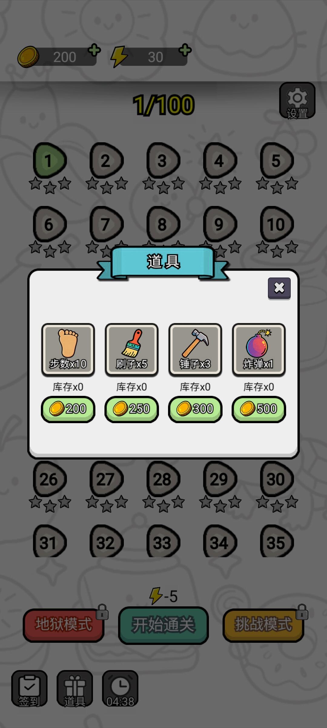 以关卡制进行游戏,游戏模式有普通、挑战、地狱三种,普通模式100关,另两种模式以关卡推进进度来解锁,地狱模式解锁需要完成100关。