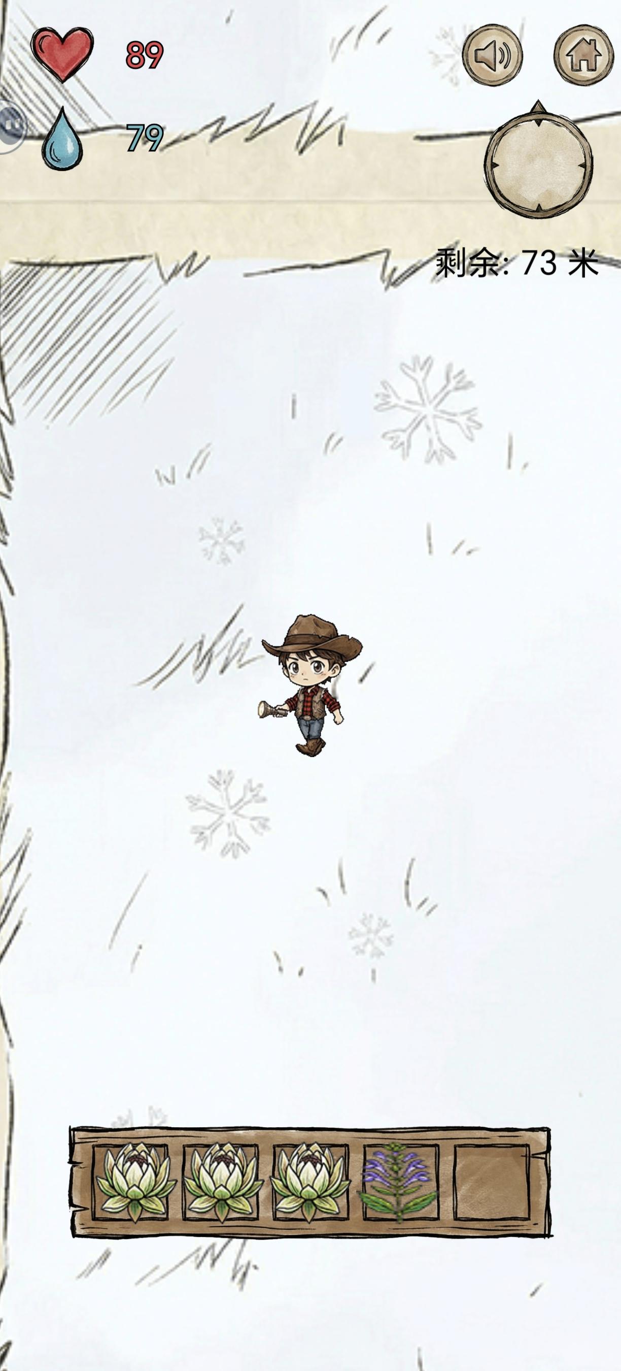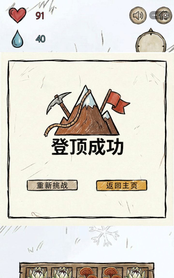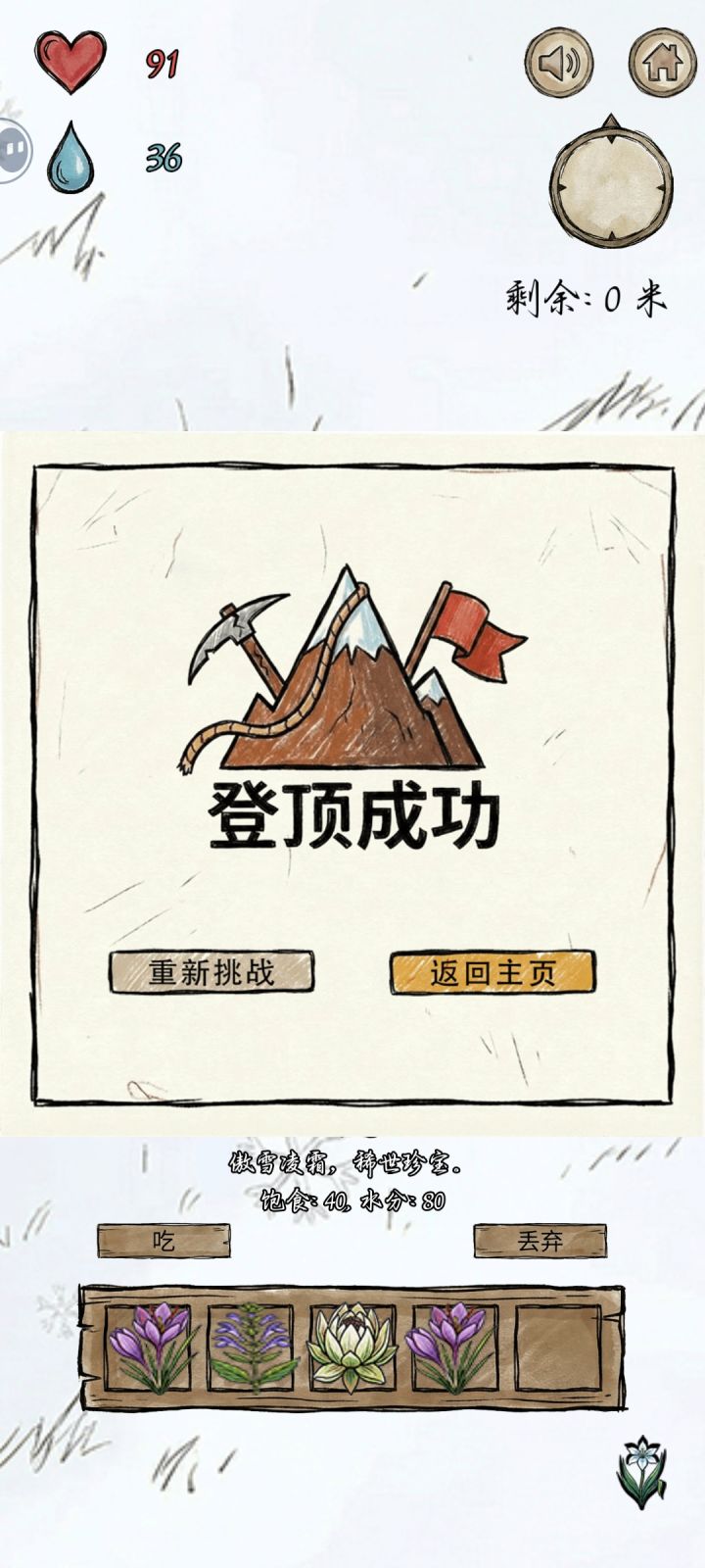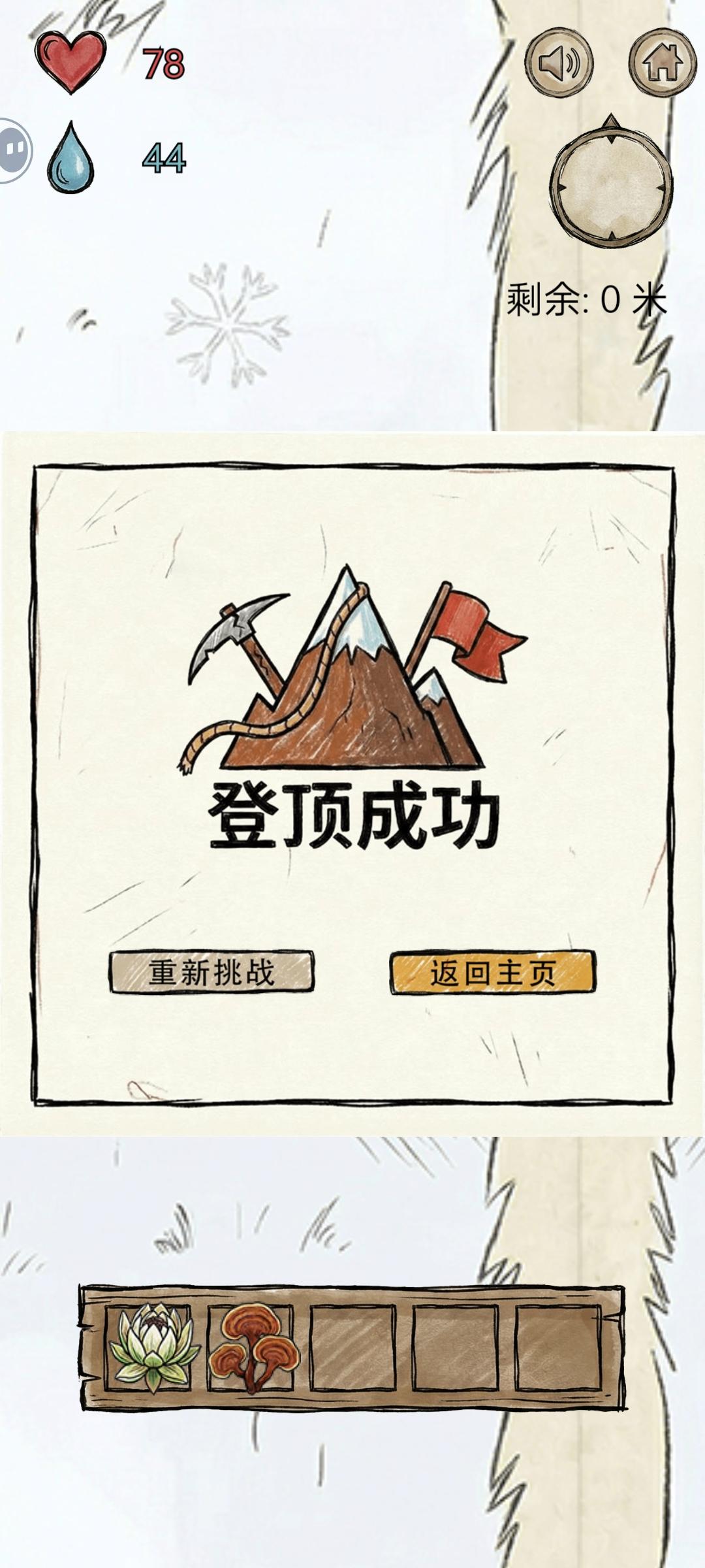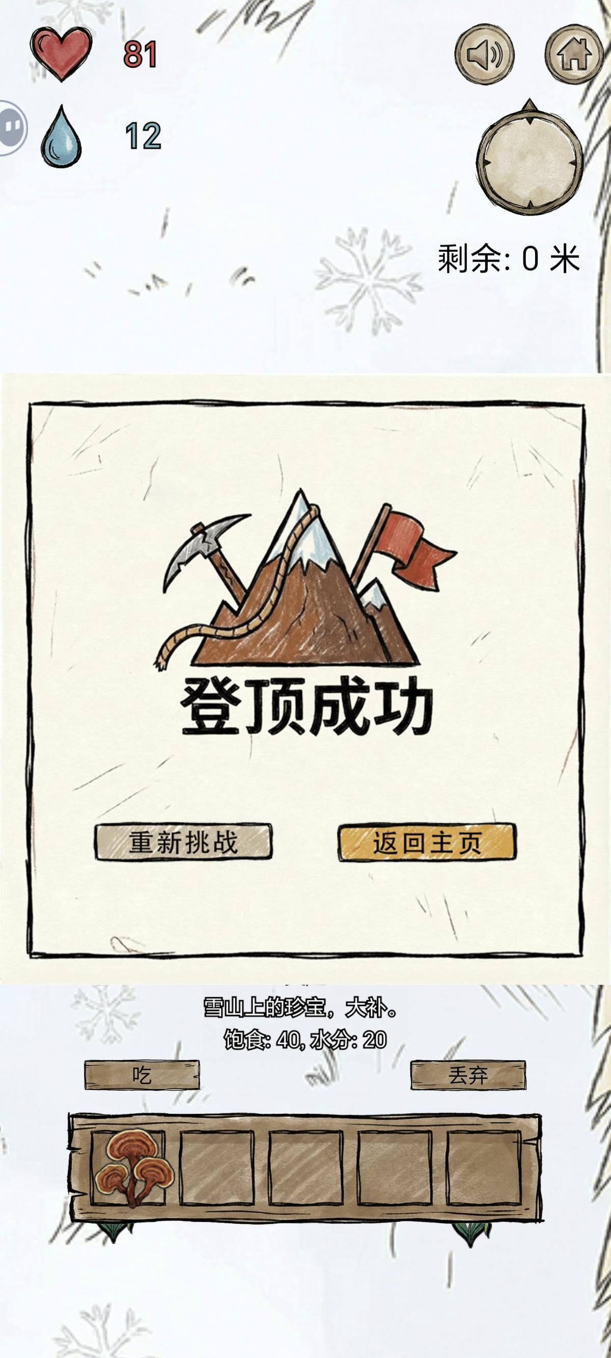 亲测有效,前面只要斜着向上移动就行,物资还挺多的,到了地岩表面能采到的植物逐渐变少,就只有:地衣(水分只有10)、薄荷、水芹菜,岩白菜(中间两种30+,白菜20+)。前期尽量囤水分比较多的植物,如蓝莓,树莓,刺梨(水分最多45左右,其他都40)不能捡的有松子,虽然加饱腹但水分减五,加饱腹的也不需要,主要维持水分。到了后面 ,最好是平移往上,推荐可以先绕一圈(40~50步) ,没有植物再逐渐上移,尤其是雪山,就只有两种植物可以采摘 ,雪莲(水分80)和灵芝(饱腹40水分20)还有,别想着一只手玩 ,没及时吃食物就很容易扑街 ,第一次玩的时候,就差200多米登顶了 ,猜猜看为什么失败?(单纯运气好,那时候不会玩 )对咯,没有及时补充水分😅