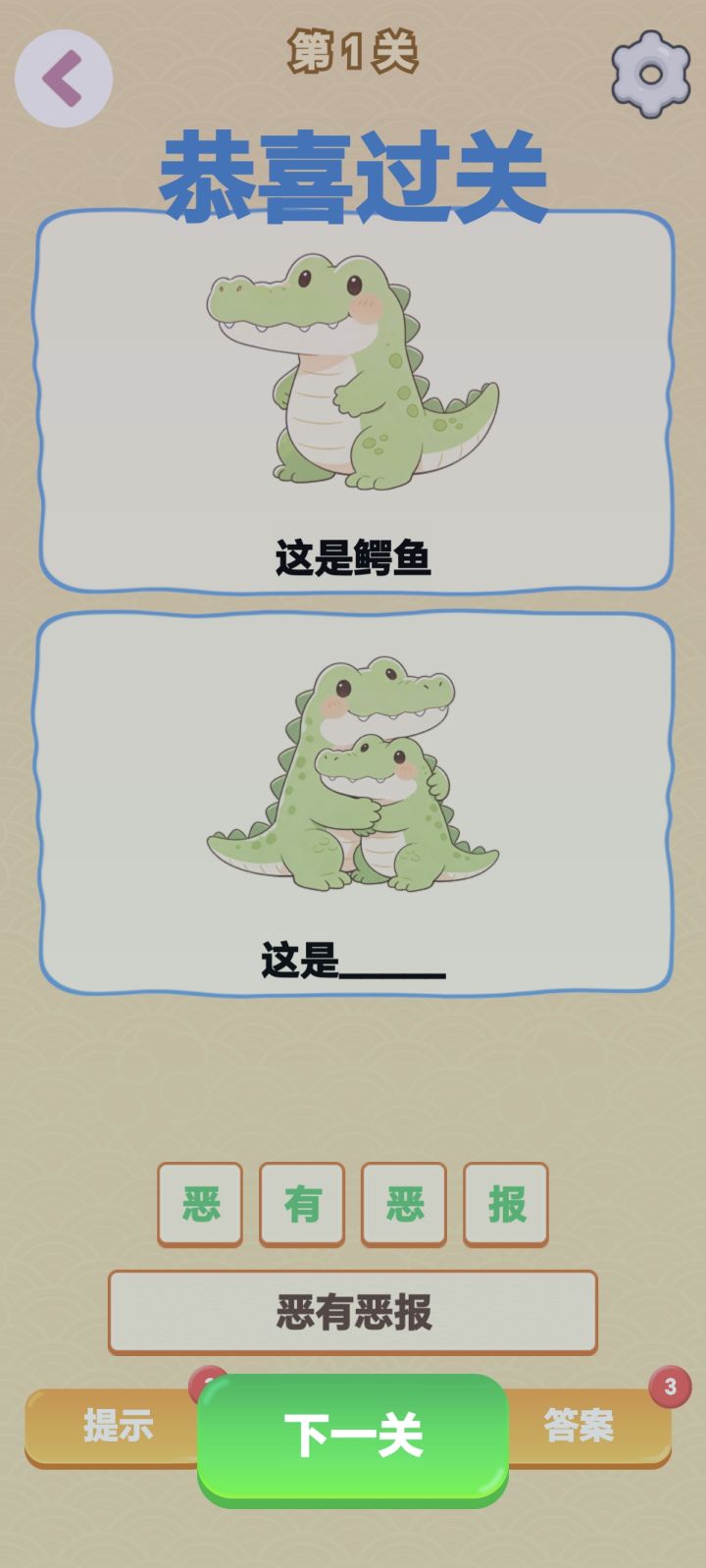 ✍🏻建议:因为在我玩的过程中,我可以明显的感觉到,他有些题目画面表现的转化到谐音过来的这个词,有一些的关联性不是很大,有一些题目需要改进一下,但是大多数都是很好的,挺有意思的,挺推荐喜欢益智休闲类游戏的玩儿一下