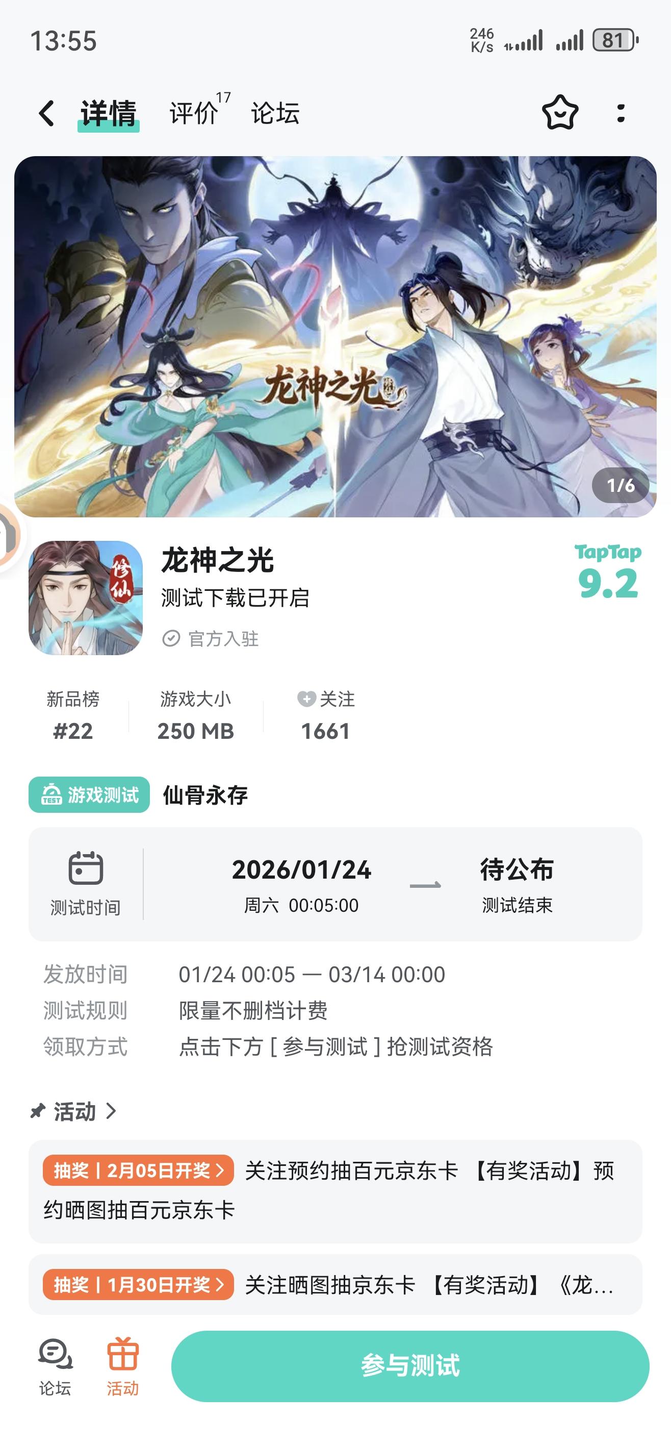 论坛专属活动已启,速来参与赢福利!预约游戏发新帖晒截图,赢百元京东卡!红颜伴修仙,情缘共长生,修真路上不再孤单。【参与方式】1.点击关注预约游戏并发新帖晒截图2.在本帖下方评论区分享发帖链接即可【活动时间】即日起至2月5日【活动奖励】随机抽取1名符合参与条件的玩家获得:100元京东卡一张【活动规则】1.内容禁止涉及暴力、色情、政治、恐怖内容,违者做删帖处理并取消活动资格;2