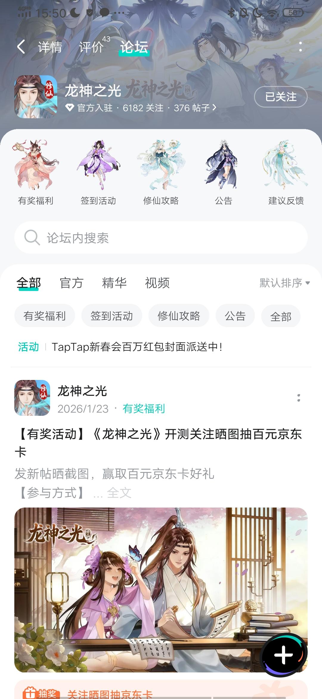 论坛专属活动已启,速来参与赢福利!预约游戏发新帖晒截图,赢百元京东卡!红颜伴修仙,情缘共长生,修真路上不再孤单。【参与方式】1.点击关注预约游戏并发新帖晒截图2.在本帖下方评论区分享发帖链接即可【活动时间】即日起至2月5日【活动奖励】随机抽取1名符合参与条件的玩家获得:100元京东卡一张【活动规则】1.内容禁止涉及暴力、色情、政治、恐怖内容,违者做删帖处理并取消活动资格;2