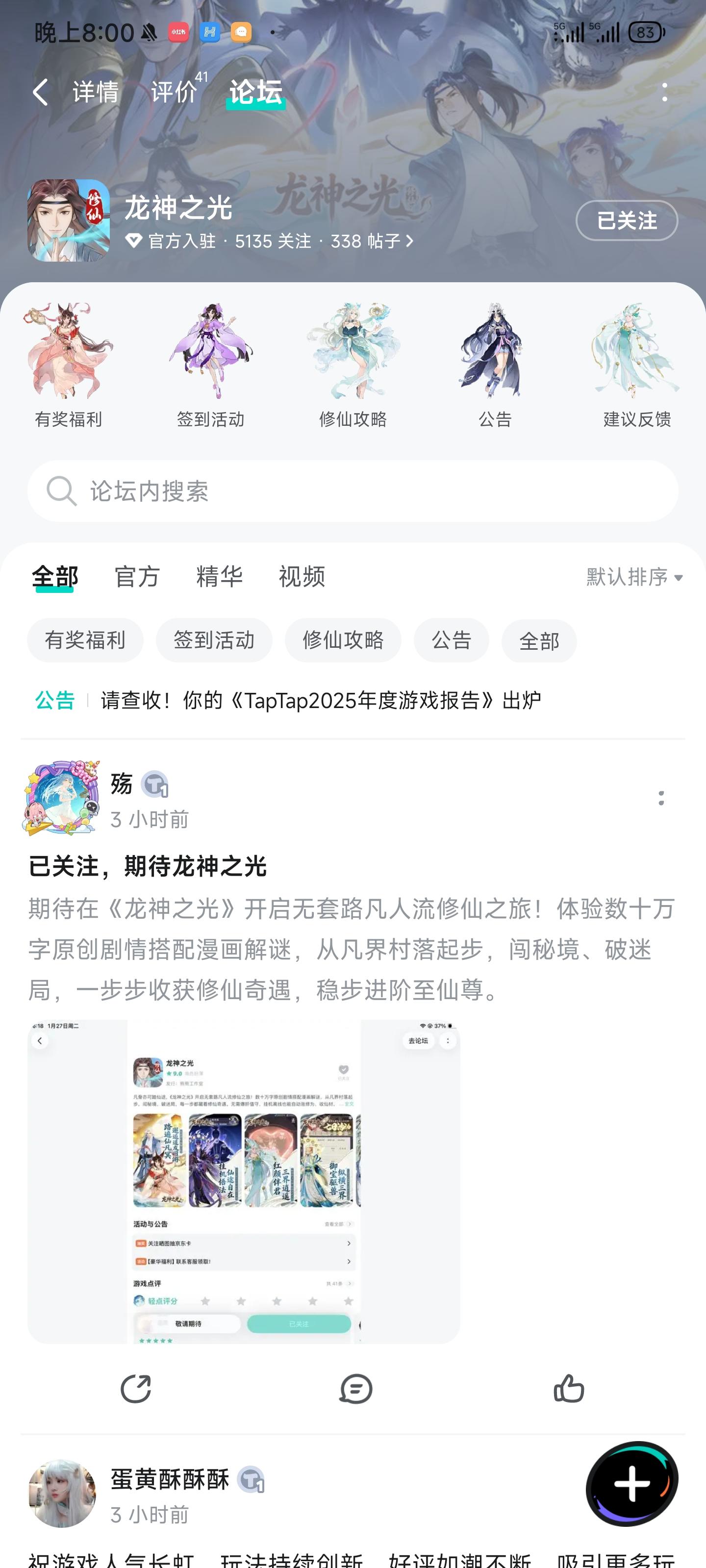 论坛专属活动已启,速来参与赢福利!预约游戏发新帖晒截图,赢百元京东卡!红颜伴修仙,情缘共长生,修真路上不再孤单。【参与方式】1.点击关注预约游戏并发新帖晒截图2.在本帖下方评论区分享发帖链接即可【活动时间】即日起至2月5日【活动奖励】随机抽取1名符合参与条件的玩家获得:100元京东卡一张【活动规则】1.内容禁止涉及暴力、色情、政治、恐怖内容,违者做删帖处理并取消活动资格;2