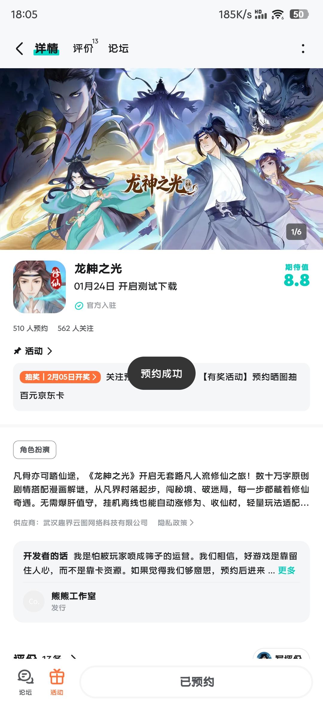 论坛专属活动已启,速来参与赢福利!预约游戏发新帖晒截图,赢百元京东卡!红颜伴修仙,情缘共长生,修真路上不再孤单。【参与方式】1.点击关注预约游戏并发新帖晒截图2.在本帖下方评论区分享发帖链接即可【活动时间】即日起至2月5日【活动奖励】随机抽取1名符合参与条件的玩家获得:100元京东卡一张【活动规则】1.内容禁止涉及暴力、色情、政治、恐怖内容,违者做删帖处理并取消活动资格;2