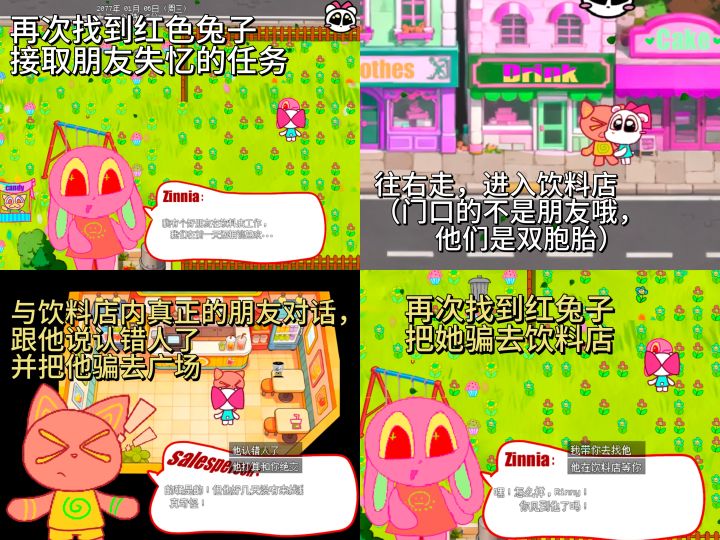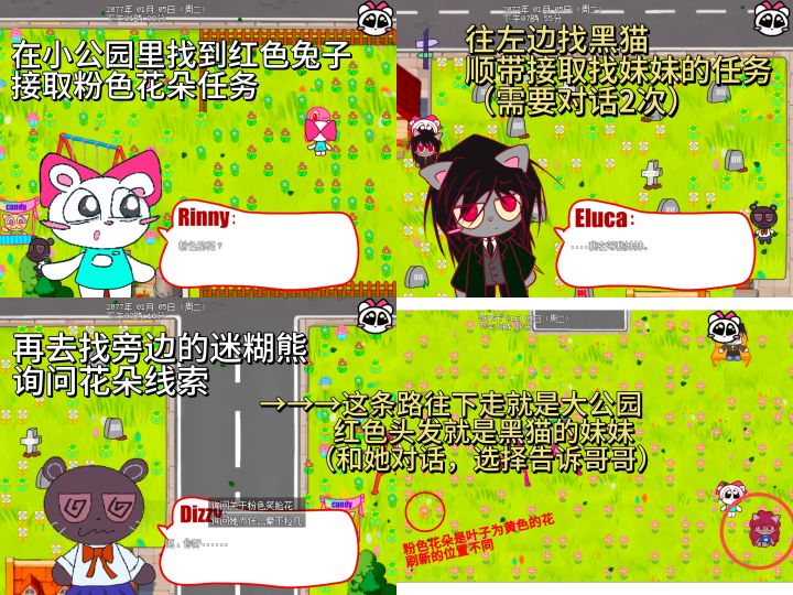 ①开局从家里出来往左走,到一个标牌被木板遮住的地方进去,这里就是公司了,往前走里面站着绿色NPC,找他接取一周目任务。②右下方向,找红色兔子接取粉色花朵任务,而后往左边走,能看见不停转圈的迷糊熊,找他询问粉色花朵信息,得知花朵在大公园里。再往左边走,红色房子前面有个黑猫,找他对话2次,接取寻找妹妹的任务。而后随着道路往下走就是大公园,右下角红色头发的就是黑猫的妹妹,跟她对话,选择告知她哥哥。大公