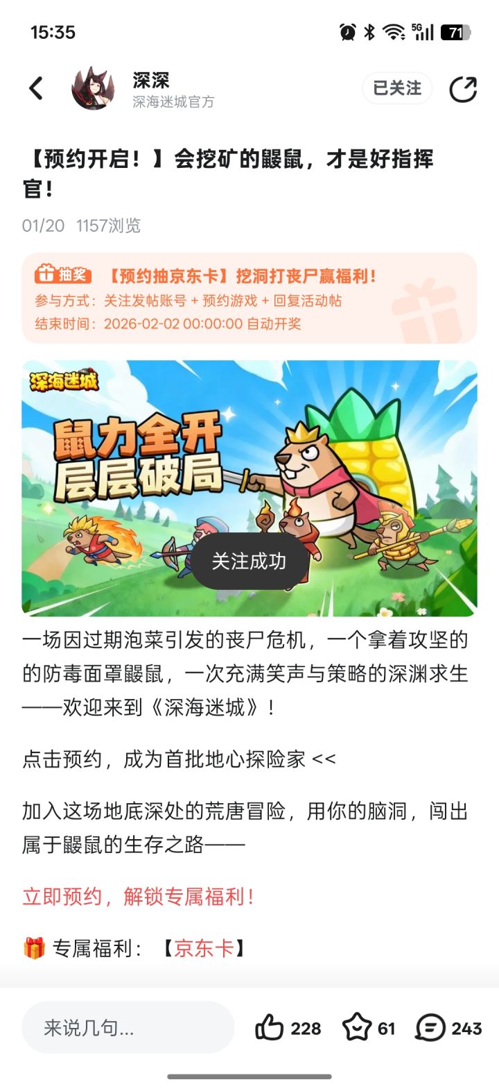 一场因过期泡菜引发的丧尸危机,一个拿着攻坚的的防毒面罩鼹鼠,一次充满笑声与策略的深渊求生——欢迎来到《深海迷城》!点击预约,成为首批地心探险家 <<加入这场地底深处的荒唐冒险,用你的脑洞,闯出属于鼹鼠的生存之路——立即预约,解锁专属福利!🎁 专属福利:【京东卡】▶ 参与方式1.点击关注发帖账号并预约《深海迷城》且发新帖晒截图2.在本帖下方评论区分享发帖链接即可【奖品发放】到达开奖