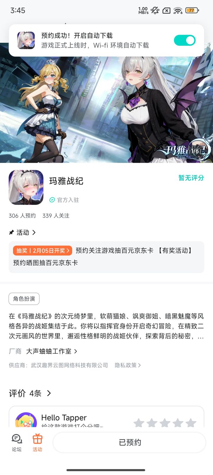 论坛专属活动已启,速来参与赢福利!预约游戏发新帖晒截图,赢百元京东卡!红颜伴修仙,情缘共长生,修真路上不再孤单。【参与方式】1.点击关注预约游戏并发新帖晒截图2.在本帖下方评论区分享发帖链接即可【活动时间】即日起至2月5日【活动奖励】随机抽取1名符合参与条件的玩家获得:100元京东卡一张【活动规则】1.内容禁止涉及暴力、色情、政治、恐怖内容,违者做删帖处理并取消活动资格;2