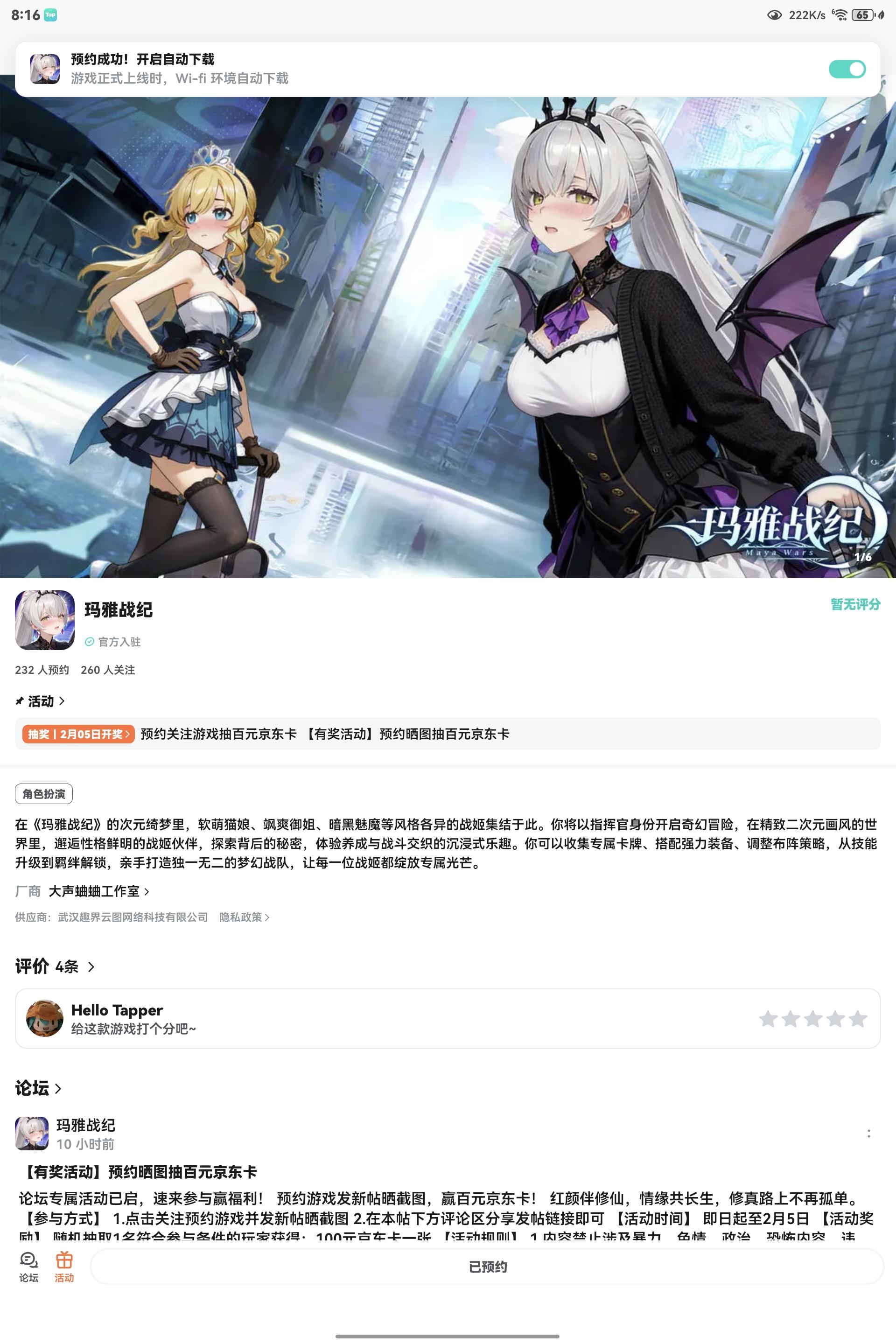 论坛专属活动已启,速来参与赢福利!预约游戏发新帖晒截图,赢百元京东卡!红颜伴修仙,情缘共长生,修真路上不再孤单。【参与方式】1.点击关注预约游戏并发新帖晒截图2.在本帖下方评论区分享发帖链接即可【活动时间】即日起至2月5日【活动奖励】随机抽取1名符合参与条件的玩家获得:100元京东卡一张【活动规则】1.内容禁止涉及暴力、色情、政治、恐怖内容,违者做删帖处理并取消活动资格;2