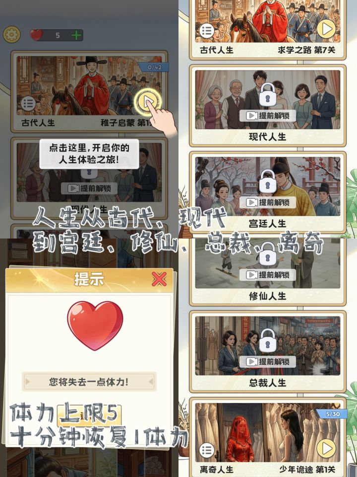 5.游戏的其他几代人生,分别是现代人生、宫廷人生、修仙人生、总裁人生、离奇人生,其中离奇人生是指诡异世界。