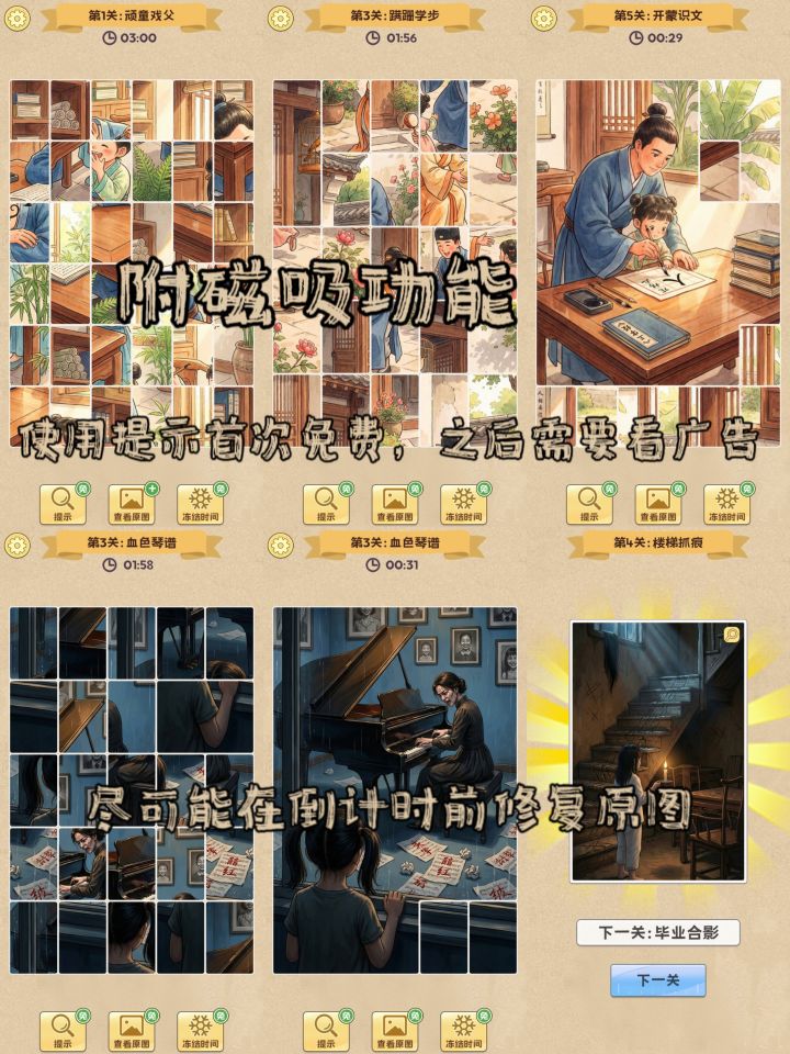 游戏中存在三类道具:提示、原图、冻结,三个功能就是字面意思,原图就是玩家可以查看原图,冻结就是让倒计时暂停,但如今这些道具只有首次免费,再用则需要玩家看广告,而如果当成玩家每一关可以三选一自选的奖励,玩家可能会更乐于游玩。