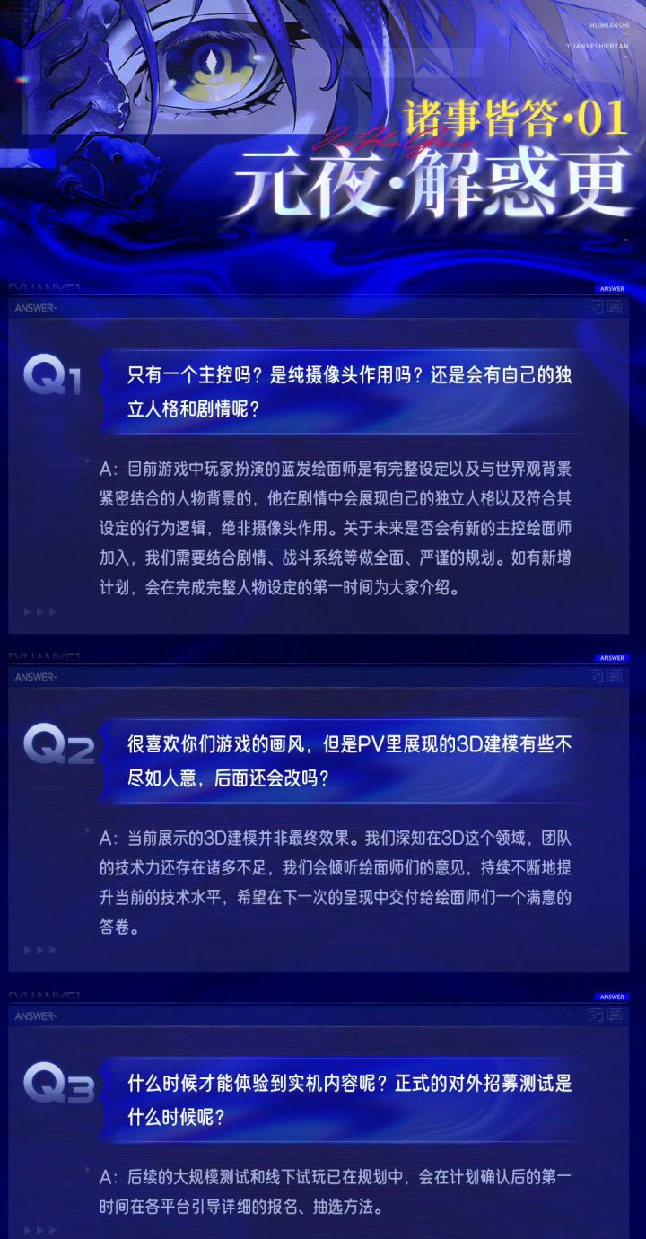 #今天游戏圈发生了啥 《元夜十二谈》官方发布「诸事皆答·01」答疑,针对首曝PV后玩家关注的主控设定、3D建模、测试时间等问题作出正式回应。当前仅设蓝发绘画师主控,具备完整世界观与独立人格,非纯工具视角;新增主控将结合剧情与战斗系统规划,设定完成后公布。官方坦言PV建模非最终效果,承认3D技术存在不足,将持续优化提升。大规模测试与线下试玩正在规划,报名及抽选方式将适时公布。角色周边已启动制作,后