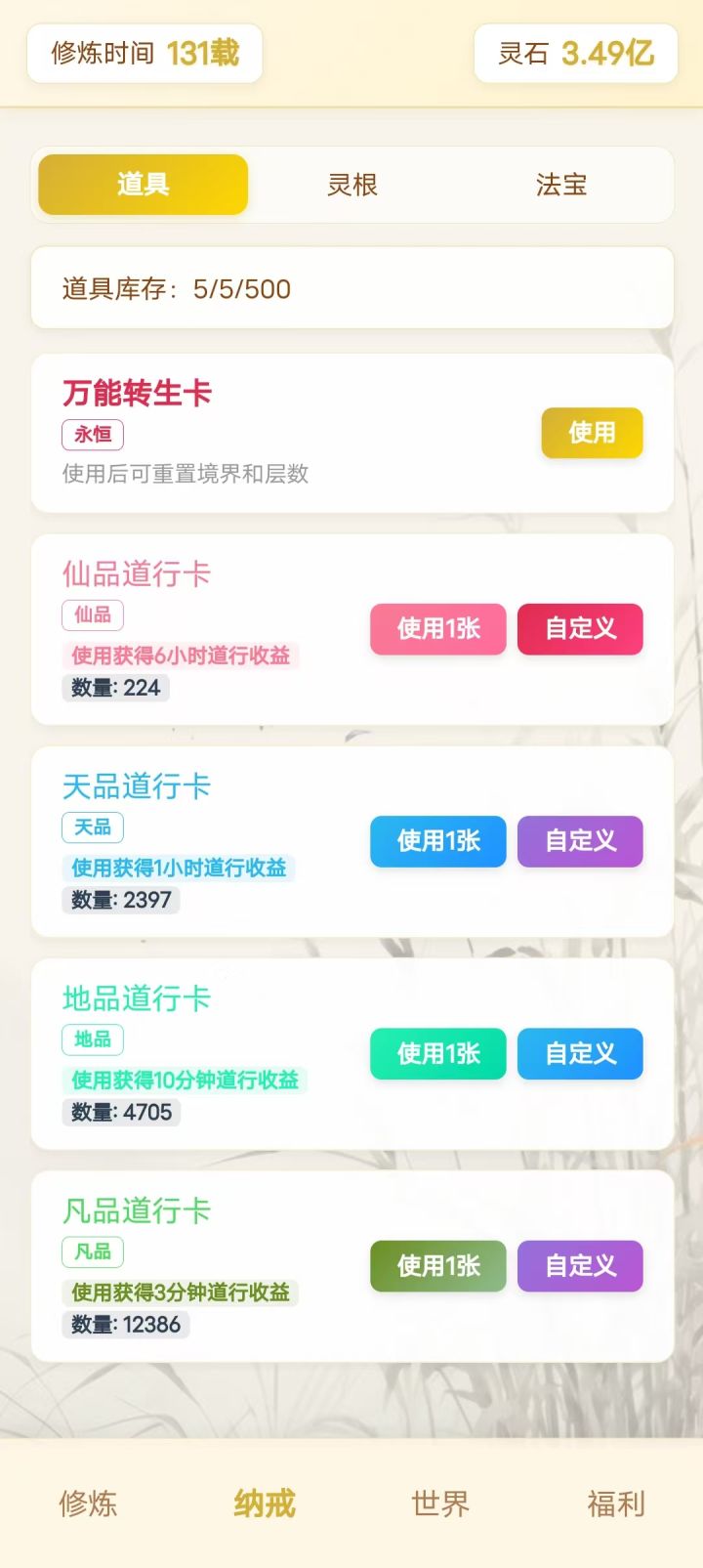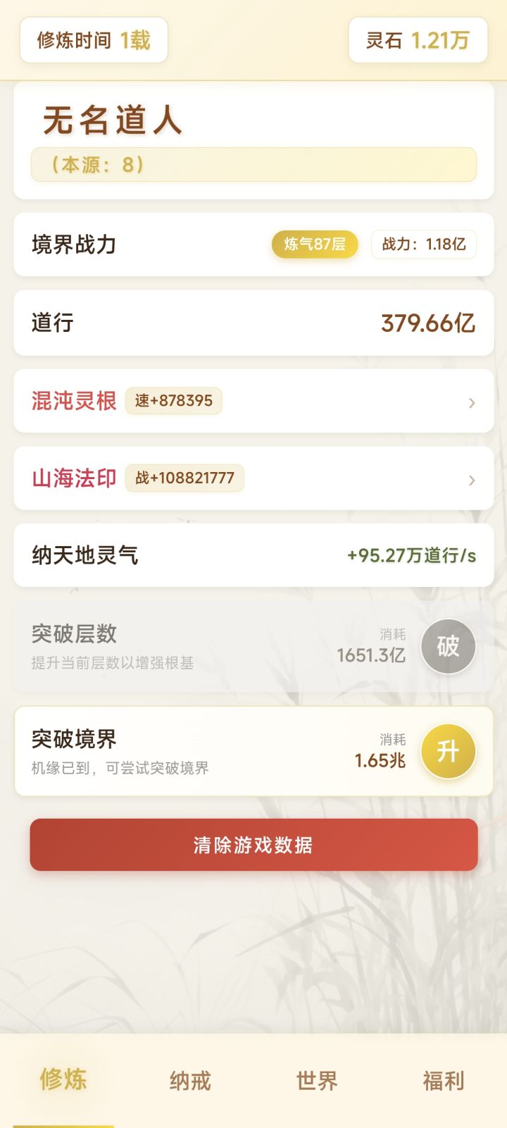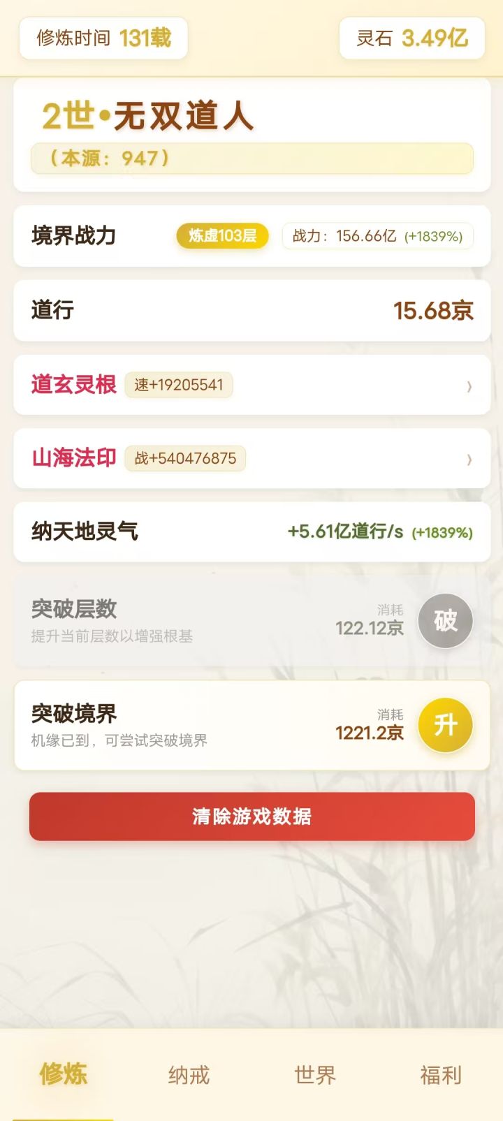 熬夜玩了几小时,中间发现能改时间,然后一直刷道行刷灵石开局用礼包码刷出玄道灵根跟山海法印,再去打世界里面的第一个大陆试炼,打通关会送一张转生卷,如果你提前打通关再清除数据刷新后打大陆试炼它不会再出转生卡,这个需要你重新卸载再下载才会出。然后开始疯狂改时间刷道行,顺带把灵田种了,灵石刷到几百万后可以疯狂百连抽,给灵根跟法印吞噬,灵根加每秒吸收道行。