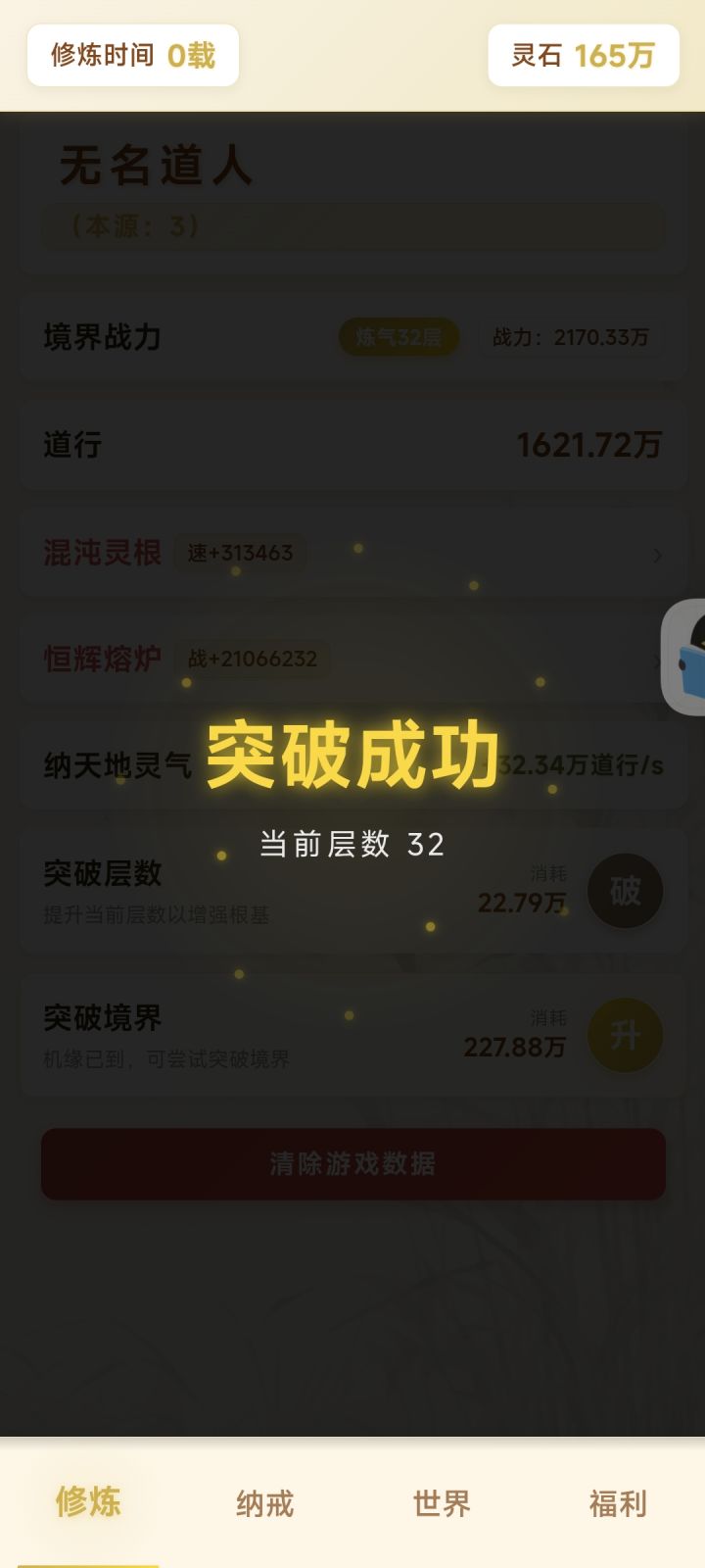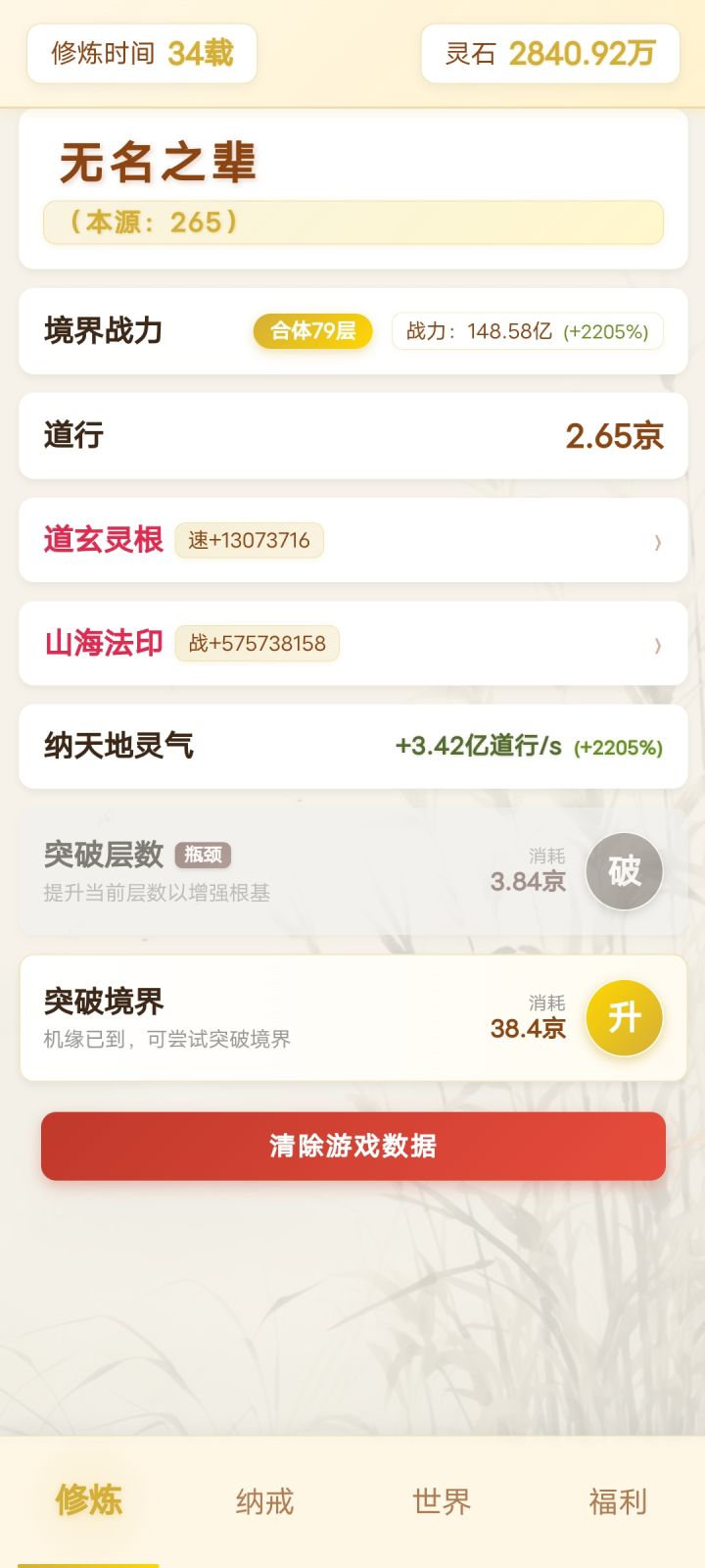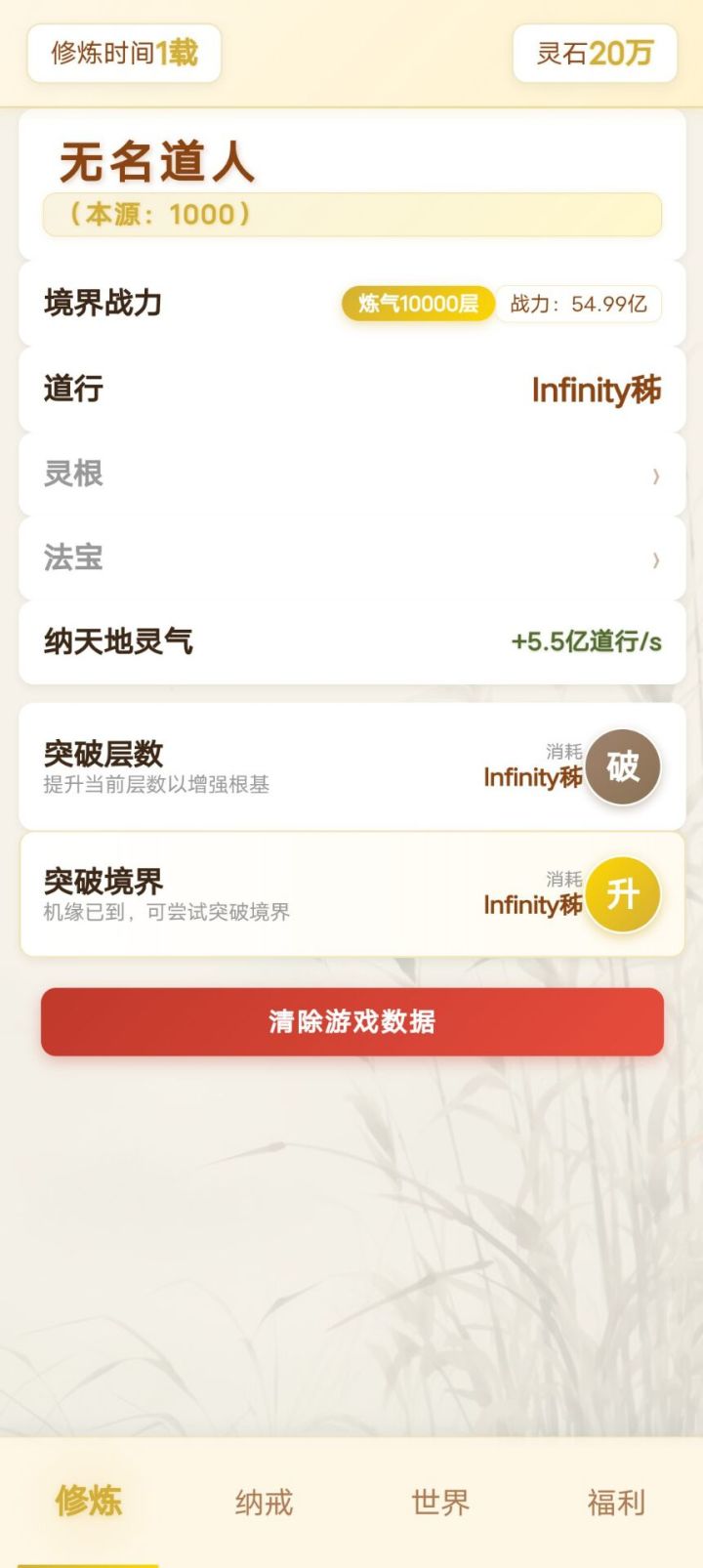 先说好,挂肯定是开的,单纯测试下,然后大概2800层到了上限(应该是10的250次方梯)然后就是infinity,可以无限点了一万层的本源是1000(也就是练气十层增加一点)战力差不多55亿纳天地灵气(无灵根无法宝,差不多5.5亿)(正常玩的话,肝到一百层还是可以的)(看了看论坛,有个87的好像,唔🤔)