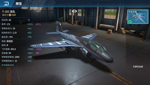 T-182迷乱是一种双引擎、中单翼的舰载机,专门担任电子作战任务,可以远距离、全天候进行高级的电子干扰活动。解锁条件:等级10飞机类型:敏捷型购买条件:200钻石赠送价格:200友谊币获取方式:商店推送、幸运宝箱抽取
