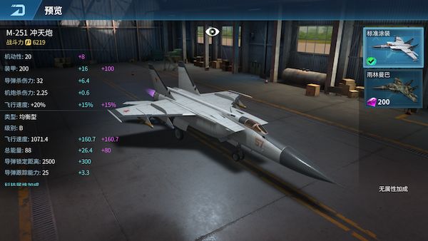 M-251冲天炮是一种高空高速截击机,采用中等后掠上单翼、两侧进气、双发、双垂尾布局型式。是主流喷气战斗机中第一个使用双垂尾的机型。飞机类型:均衡型获取方式:幸运宝箱抽取