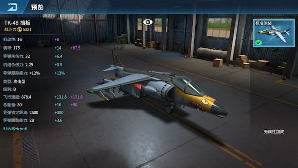 类型:敏捷型基本型战机突出高空、高速特性,具有轻小灵活、低成本、高效率和使用维护简单等技术特点。满级属性