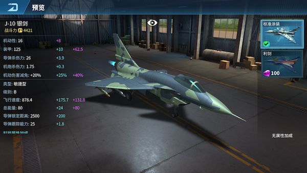J-10银剑是一款单发、全天候、多功能、采用鸭式气动布局的第四代中型战斗机。解锁条件:等级8飞机类型:敏捷型购买条件:6000金币提前购买:100钻石