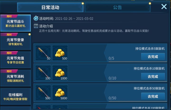 春节刚过,又将迎来一个传统佳节——元宵节。《现代空战3D》手游携好礼提前祝大家元宵节快乐!活动时间:2021.2.26~2021.3.2活动一:元宵节累计战斗正月十五闹元宵!元宵活动期间,驾驶任意战机完成累计战斗活动,赢取节日战斗奖励!#1、[排位击杀]*5,[AAM-27R撒克导弹]*50,[金币]*500#2、[排位击杀]*10,[AAM-27R撒克导弹]*100,[金币]*1000