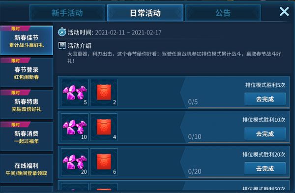 伴随着时光老人的脚步,我们刚刚告别了圣诞,似乎有些意犹味尽。而接下来的元旦却又为我们增添了更多的节日气氛,祝元旦快乐!活动时间:2021.1.1~2021.1.5活动一:新年战斗新年战斗,每日驾驶任意战机参与排位模式战斗,赢取新年战斗好礼!#1、 [排位胜场]*1,[金币]*500,[低级经验卡]*1#2、 [排位胜场]*3,[能量水晶颗粒]*30,[低级金币卡]*1#3、 [排位胜场