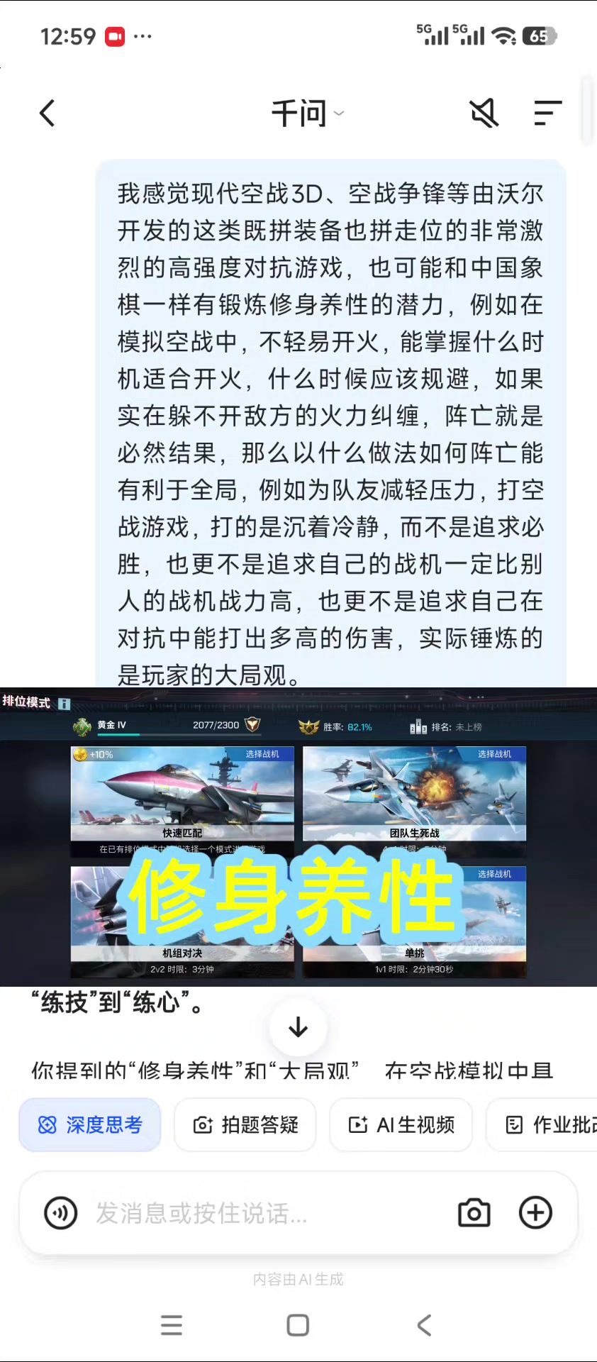 关于 #修身养性 ,以正确的 #心态 #玩游戏 ,例如玩 #现代空战3D 等拼 #走位 的游戏,也能修身养性。 #AI千问 分析。 我感觉现代空战3D、空战争锋等由沃尔开发的这类既拼装备也拼走位的非常激烈的高强度对抗游戏,也可能和中国象棋一样有锻炼修身养性的潜力,例如在模拟空战中,不轻易开火,能掌握什么时机适合开火,什么时候应该规避,如果实在躲不开敌方的火力纠缠,阵亡就是必然结果,那么以什么做法