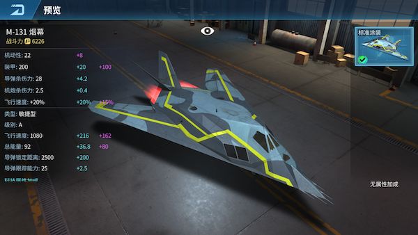 M-131烟幕是一种单座双引擎,采用了很高后掠角的后掠翼隐身攻击机,也是世界上第二款完全以隐形技术设计的飞机。解锁条件:等级12飞机类型:敏捷型购买条件:375钻石赠送价格:375友谊币获取方式:商店赠送、幸运宝箱抽取