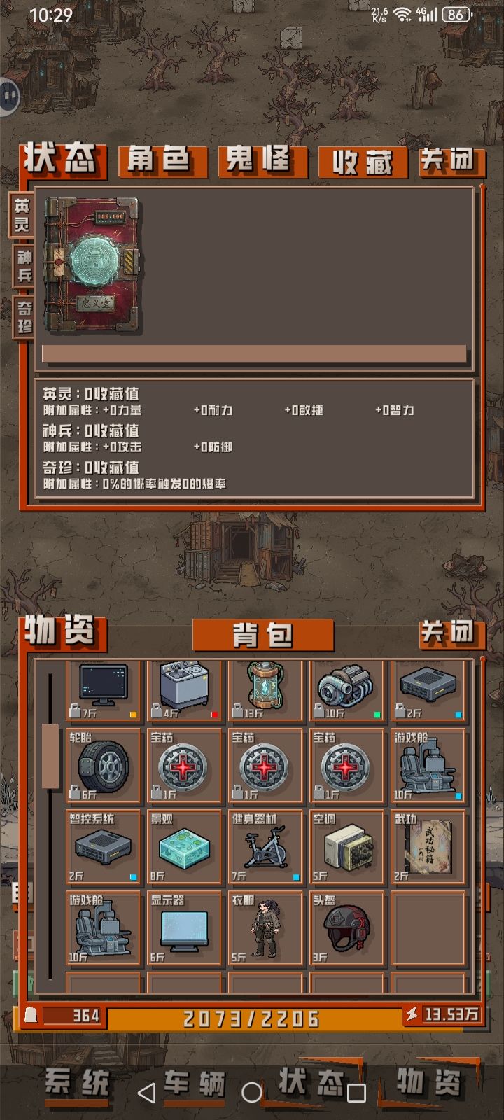 1.我在拾取物资时,被小怪碰了一下,物资全消失了。2.我知道这个桶是怪了,遇到一次解释一次,多余了。3.伤害咱就不说。那个衣服装备还搞男女?4.那个收支平衡太差了。作者没有调研过回收废旧物品。全新是市场价八折,依次往下折。但是装备和物品也不会特别便宜。买一件要1000多,我整个背包加起来卖出去才800多,太夸张了,还有那个充能,根本充不起。我也不知道自己有多少钱,没有个显示。反正游戏bug太