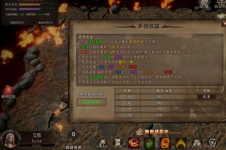 更新内容:1,增加配菜大师,挑战可以获得暗黑神石和白金币2,挑战地图怪物属性显示在面板正确了,之前是AI乱写的.3,怪物攻击属性进行了全面的重构, (之前的属性是AI乱写的)4,主角面板防护页 显示当前总减伤百分比 (准确率90%以上)5,增加神话装备,21层以上挂机地图掉落碎片,年兽也会掉落碎片6,红包和年兽延期到元宵节后7,神秘商人增加离线购买(小于100级的玩家可以买)8,修