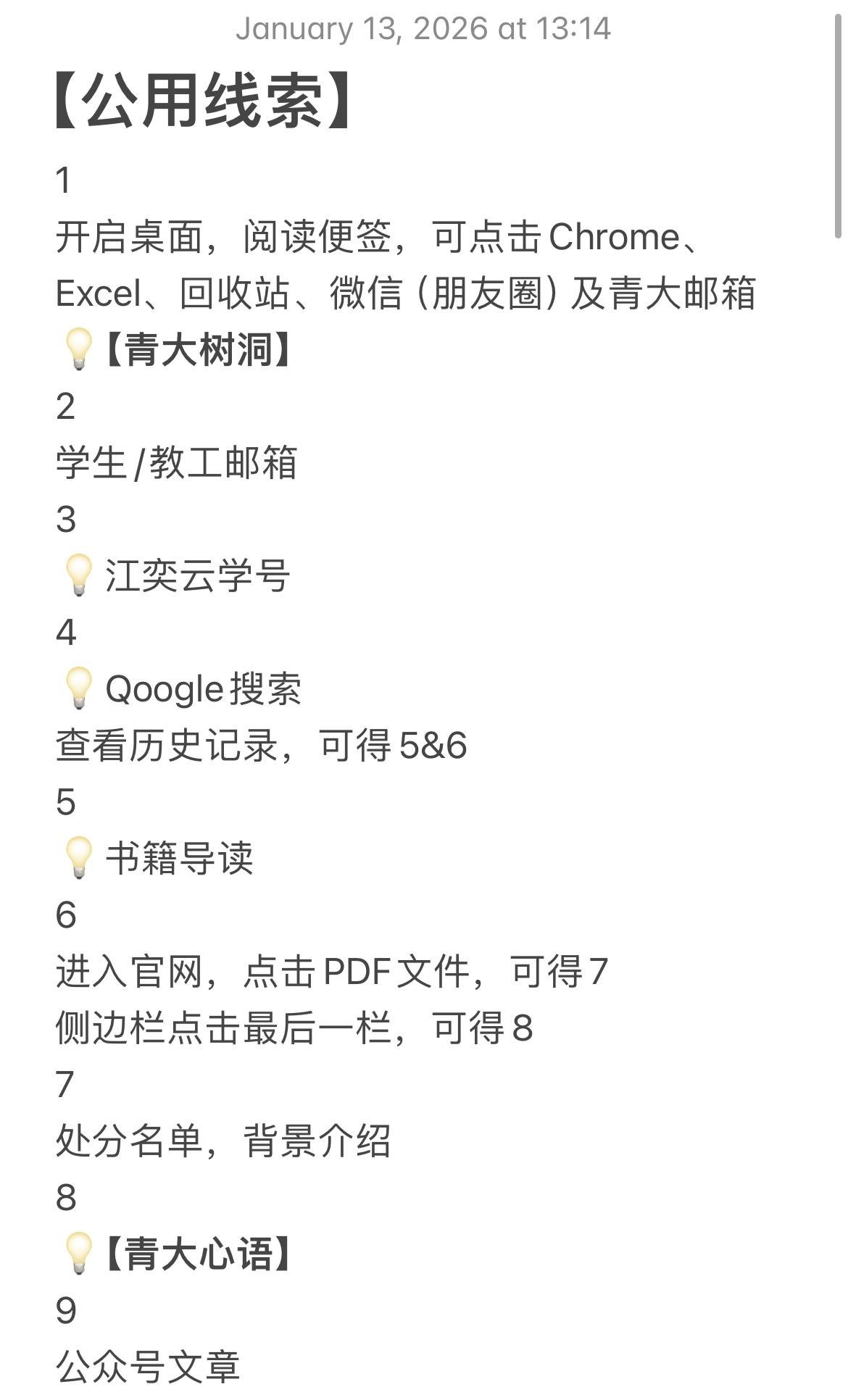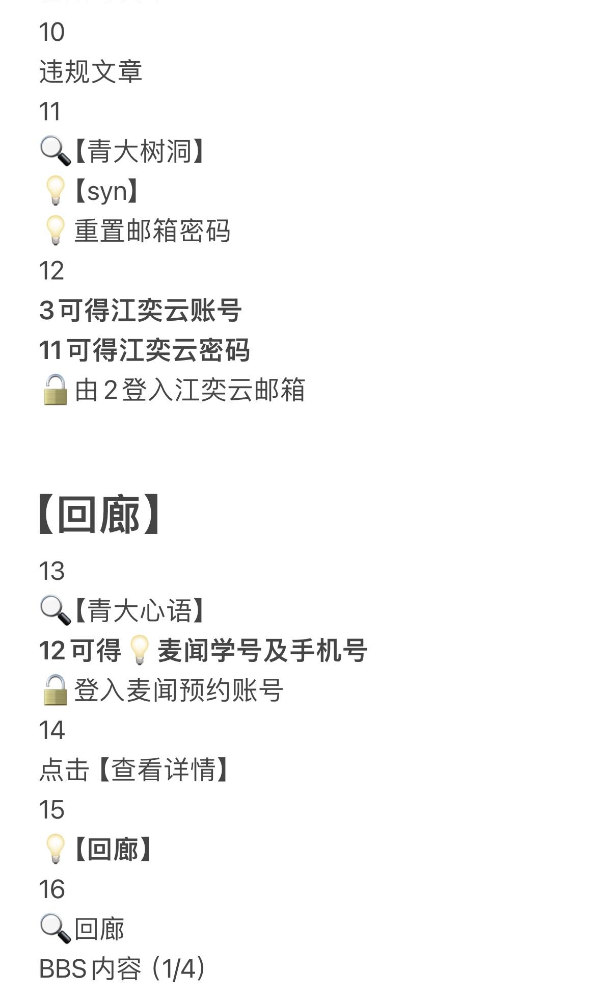 【公用线索】1备忘录、Chrome、Excel、微信(朋友圈)及青大邮箱💡【青大树洞】2学生/教工邮箱3💡江奕云学号4💡Qoogle搜索查看历史记录,可得5&65💡书籍导读6进入官网,点击PDF文件,可得7侧边栏点击最后一栏,可得87处分名单,背景介绍8💡【青大心语】9公众号文章10违规文章11🔍【青大树洞】💡【syn】💡重置邮箱密码123