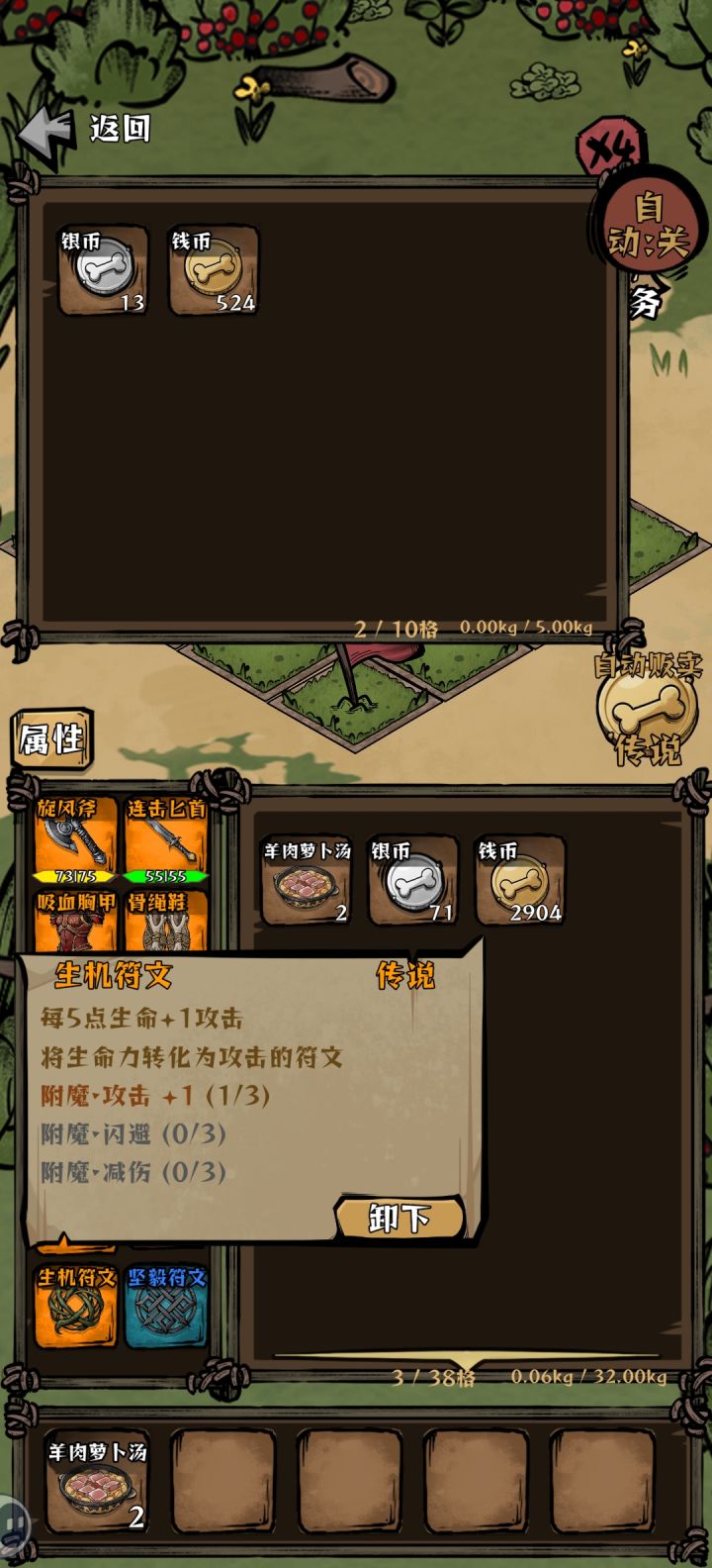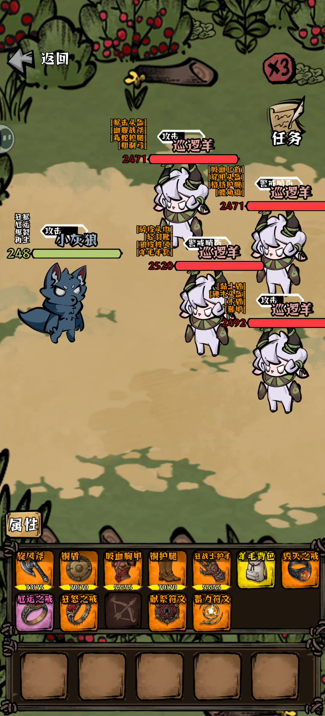 毕业武器-嗜血战斧\疾风双刃副手-铜盾(因为我们是满爆就不用羊角了)头部-前期羊村守卫头,后期野山羊角头盔(暴击头没实装,如果实装了建议带暴击头)胸部-吸血胸甲腿部-铜护腿,前期用粘土过度也不错(暴击腿没实装,不然就带暴击腿)手臂-前期铜护手或者狂战士,后期吸血护手双吸血戒指-狂怒戒指符文-献祭符文+坚毅符文3个属性转换符文15生命=1攻击3攻击=1防御4防御=1攻击首先这